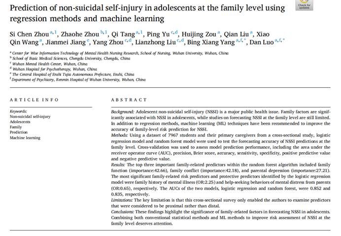 近来,抖阴 杨冰香课题组在《Journal of Affective Disorders(中科院二区TOPJCR一区;IF=6.533)期刊上发表了从家庭层面探索青少年非自杀性自伤风险预测因素的最新研究成果(见图1)。论文题目为“Prediction of non-suicidal self-injury in adolescents at the family level using regression methods and machine learning”。抖阴 为该论文第一作者和通讯作者单位,其中抖阴 2021级硕士研究生周思辰、2020级本科生汤琦,成都大学基础医学院周兆河老师为共同第一作者,抖阴 罗丹老师、杨冰香副教授为共同通讯作者。
