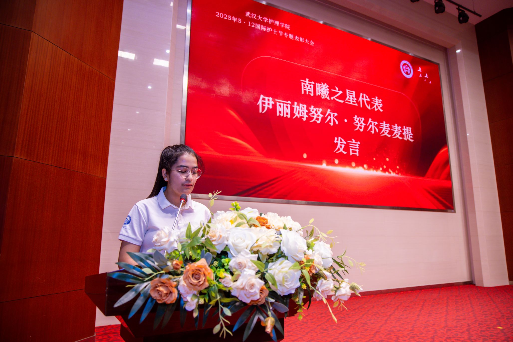 南曦之星代表伊丽姆努尔·努尔麦麦提上台分享了自己从昆仑天山到珞珈山的追梦之路。护理专业的学习与实践,更加坚定了她“一颗红心向着党,矢志不渝跟党走”的理想信念以及立志返回新疆、建设家乡的使命担当,展现出了新时代护理学子积极向上、勇于担当的精神风貌。