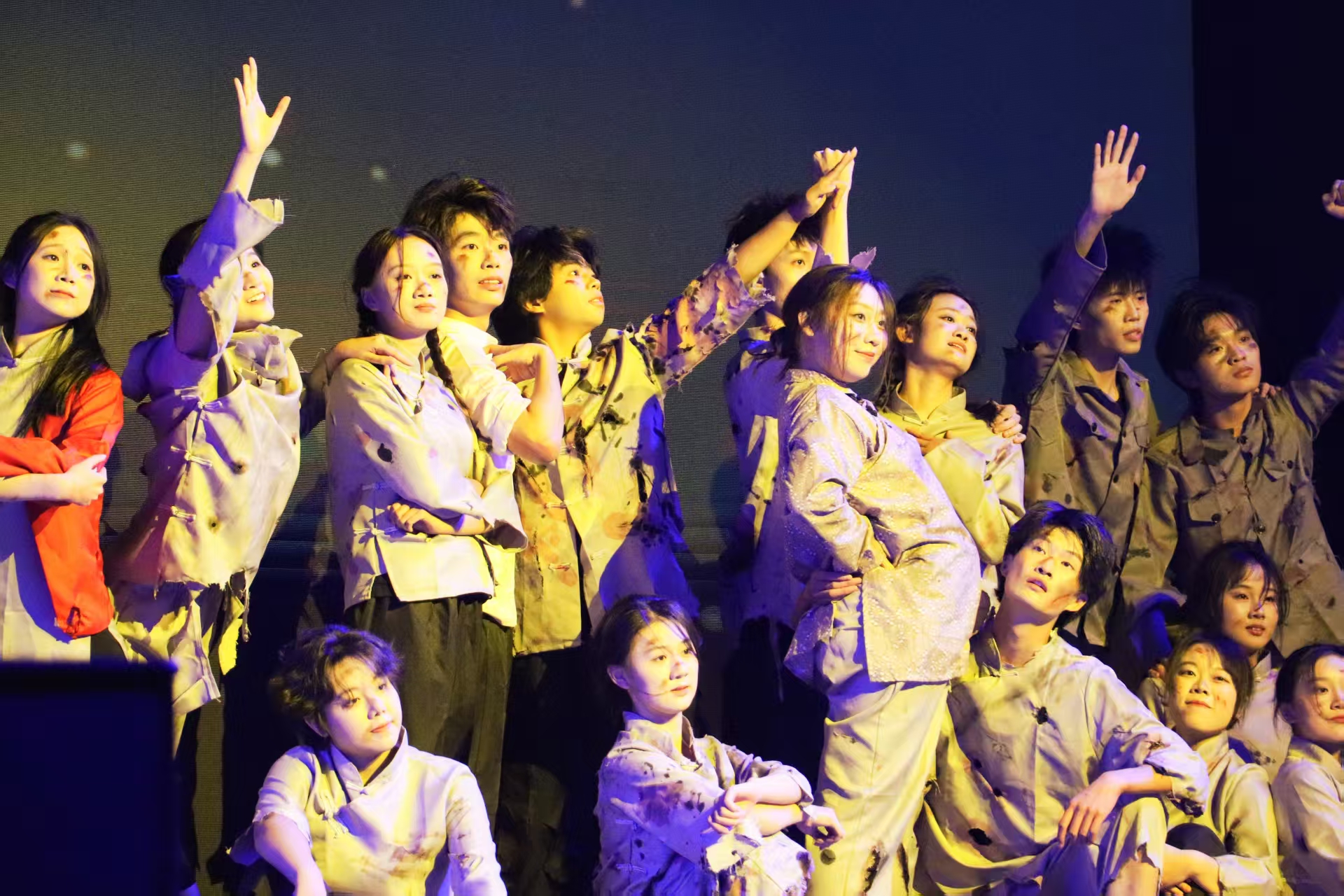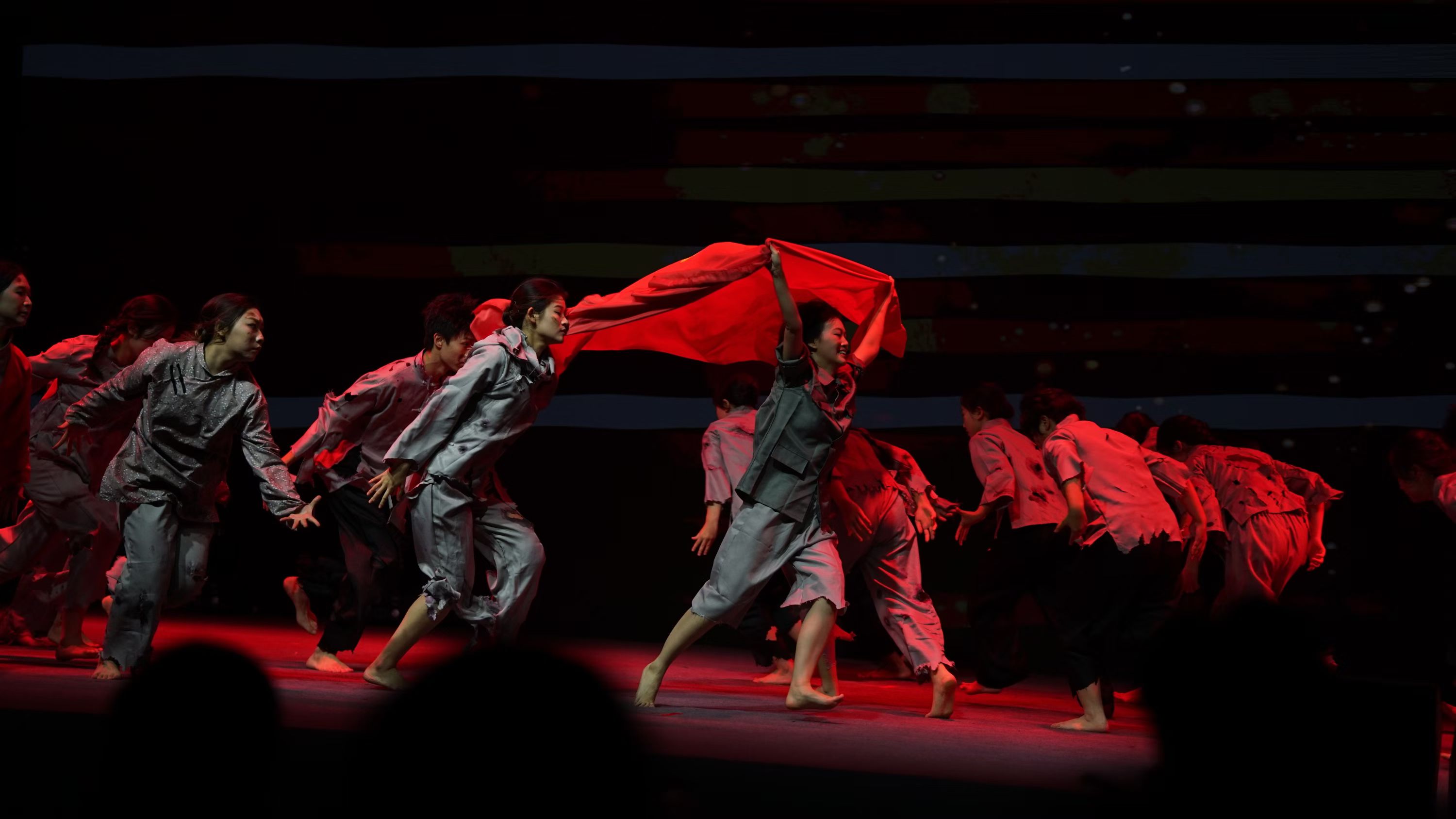 舞台之上,灯光亮起的瞬间,同学们身着素朴粗布衣衫,眼神坚定而炽热,瞬间将观众的思绪拉回硝烟弥漫的抗战年代。表演中,她们手臂相挽,化作众志成城的坚固战壕;俯身弓步,模拟穿越枪林弹雨的奋勇冲锋;当一人以“中弹”姿态倒地,同伴们迅速伸出托举的手臂,诠释着生死与共的战友情深。高潮时刻,所有舞者依次传递红旗,定格的画面震撼人心,台下掌声与哽咽声交织回荡 —— 这不仅是一场舞蹈表演,更是一次跨越时空的精神传承。