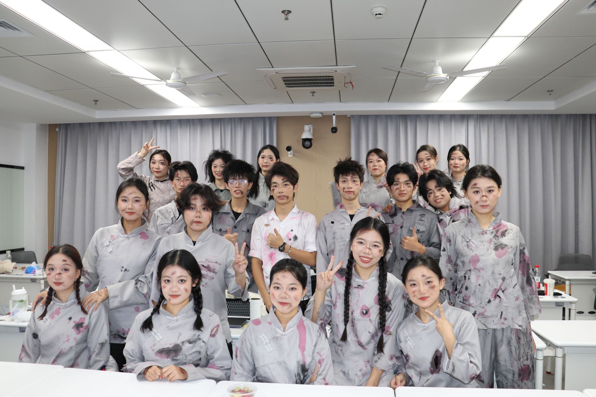 为完美诠释作品内涵,同学们在备赛期间付出了大量心血。无数个晨光熹微的清晨,无数个星月交辉的夜晚,排练室的镜子前始终映照着他们专注而紧绷的身影。为精准还原抗战军民的姿态神韵,队员们反复观看抗战历史影像,逐帧模仿战士冲锋的步伐与神情;为打磨“牺牲”片段的情感表达,他们深入揣摩历史情境,让共情与热泪融入每一次俯身、每一次跃起。膝盖上的淤青、磨破的舞鞋,皆是他们与历史对话、向先烈致敬的鲜活印记。