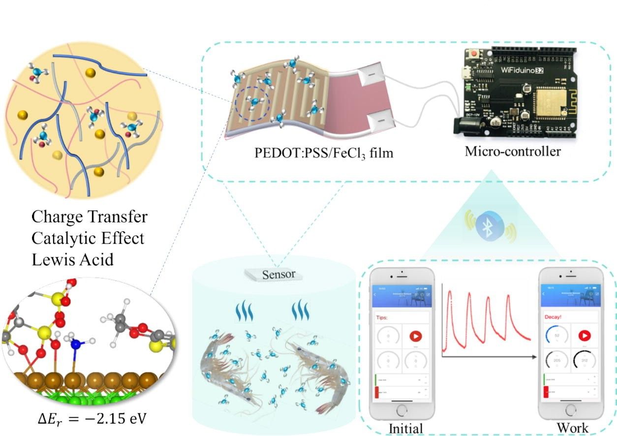 氨是食品变质的重要标志物,但目前的传感器缺乏足够的灵敏度、稳定性、选择性和自动化,在实际应用中无法实现现场实时监测。为解决上述局限性,本研究提出了一种基于PEDOT:PSS掺杂Lewis酸的高灵敏度柔性氨传感器,用于无线食品监测。薄膜中的Fe3+和水解的H+PSS链上的SO3基团配位引起的插层效应导致相邻的富PEDOT域之间的距离增加。通过在PEDOT:PSS分子内提供额外的离子型载流子和载流子传输路径来增强氨敏感性。结果表明,FeCl3掺杂的PEDOT:PSS传感器的灵敏度显著提高,在25℃下,对1ppm NH3的响应值约为25%,检测限为0.23ppm,定量限为0.78ppm(1 - 400ppm)。此外,传感器在1ppm (RSD=4.30%)100ppm(RSD=3.61%)下均具有可接受的重复性,且具有良好的选择性和长期稳定性。XPS、拉曼分析和密度泛函理论(DFT)计算进一步阐明了该传感器对氨的传感机理。最后,设计了一种便携式无线检测装置,通过蓝牙通信和单片机系统对新鲜基围虾的腐败过程进行检测,利用智能手机实现了对食物新鲜度的无线实时监控。