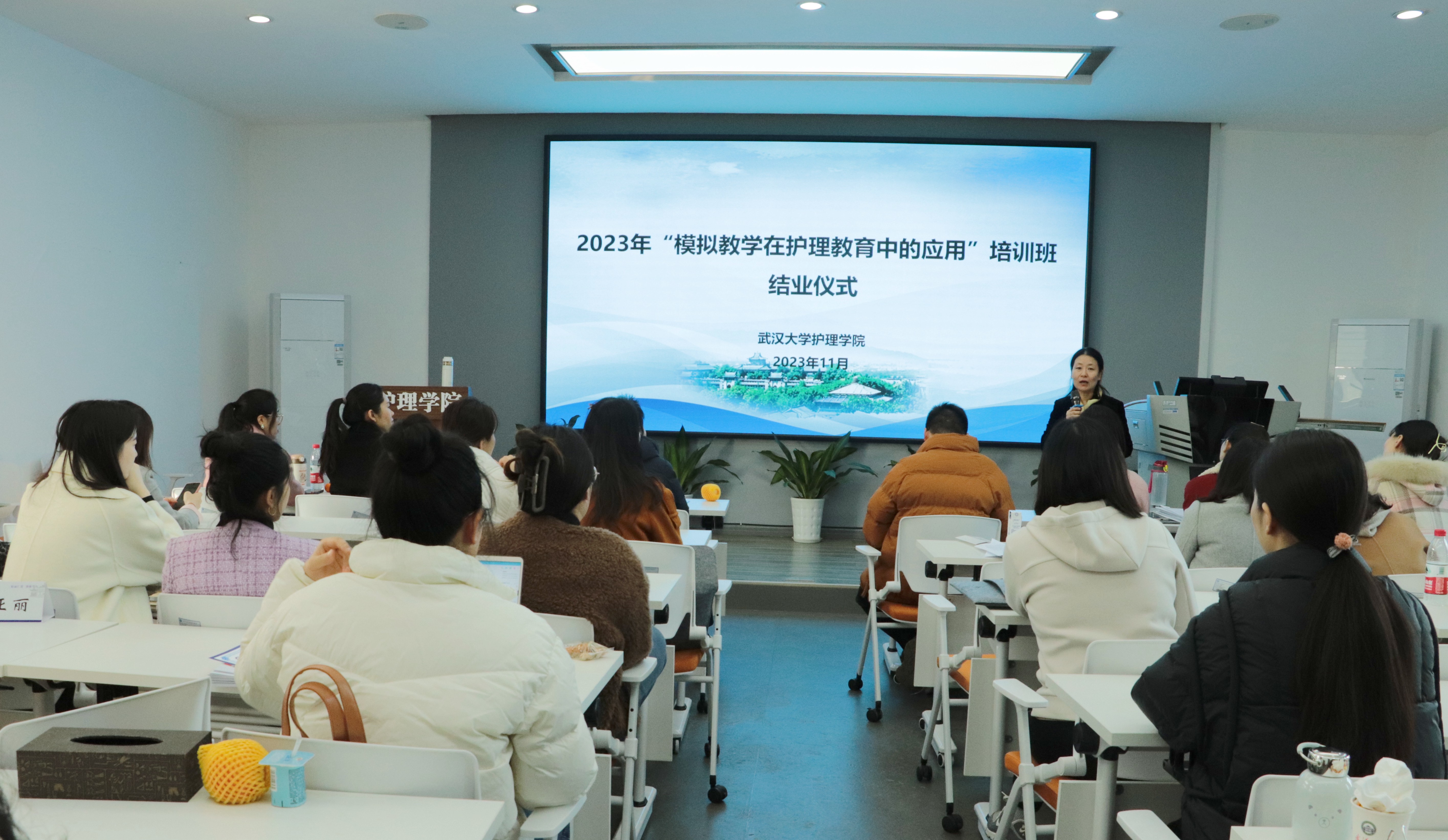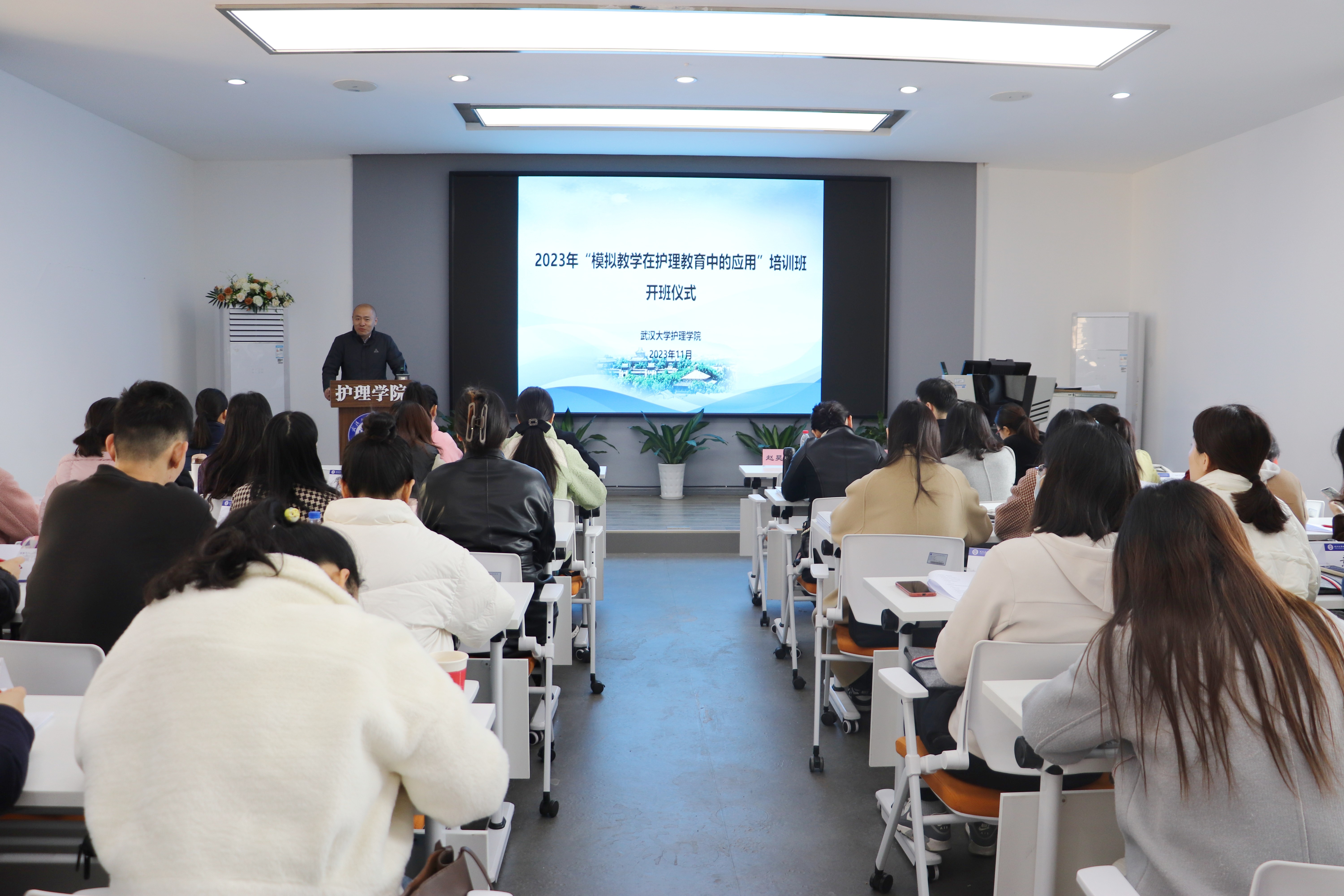 在2601报告厅举行2023年“模拟教学在护理教育中的应用”培训开班仪式,学院党委书记赵昊鲁、党委副书记罗睿、副院长杨冰香出席此次开班仪式。开班仪式由实验教学中心副主任蔡春凤主持。