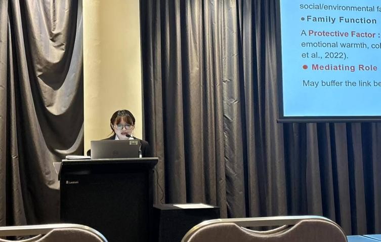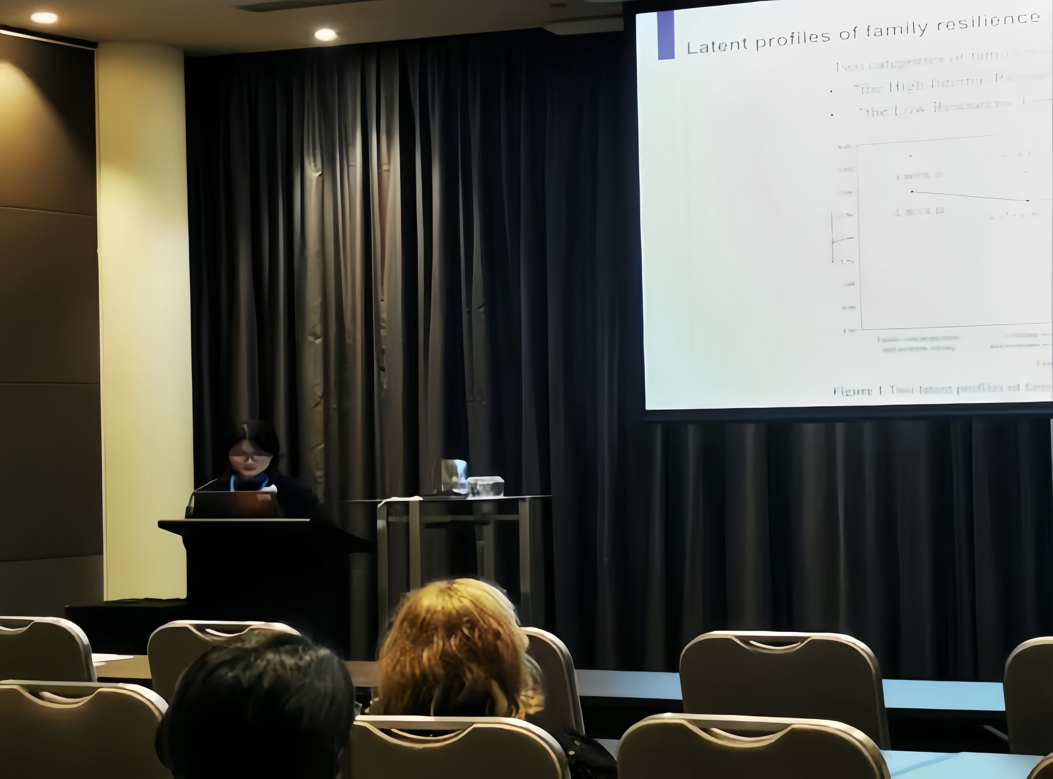 研究中心的罗丹副教授、学生张艺文、付何云、李博文和李梦娜全程参加了此次研讨会,并认真聆听了大会的各个专题演讲。5位成员分别在大会上对自己的研究成果进行了口头汇报。罗老师以《The Family Adaptation Model Among Adolescents with Non-Suicidal Self-injury: A Grounded Theory Research》为题,介绍了基于扎根理论构建了青少年非自杀性自伤(NSSI)行为背景下的家庭适应模型,深入揭示了家庭在面对青少年自伤行为时的动态互动机制与适应路径,为相关干预和支持策略的制定提供了理论依据。