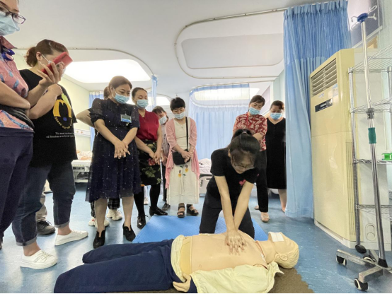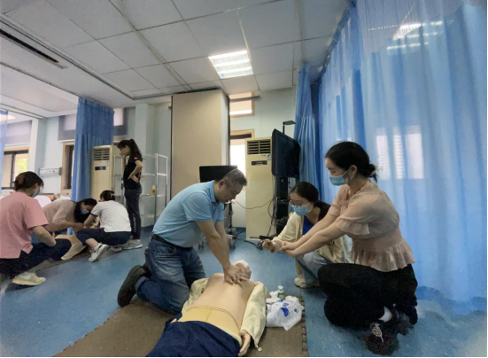 同学演示了心肺复苏术、海姆立克急救法以及包扎方法等基本操作,并指导、鼓励参训人员亲自动手练习,确保掌握技术要点,熟悉急救过程。