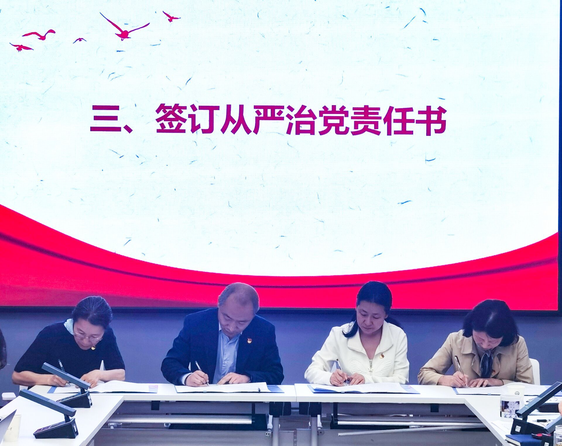 会后,党委书记赵昊鲁、院长周芙玲与党支部书记、教研室主任代表张青、王素青老师签订三级党风廉政建设责任书。