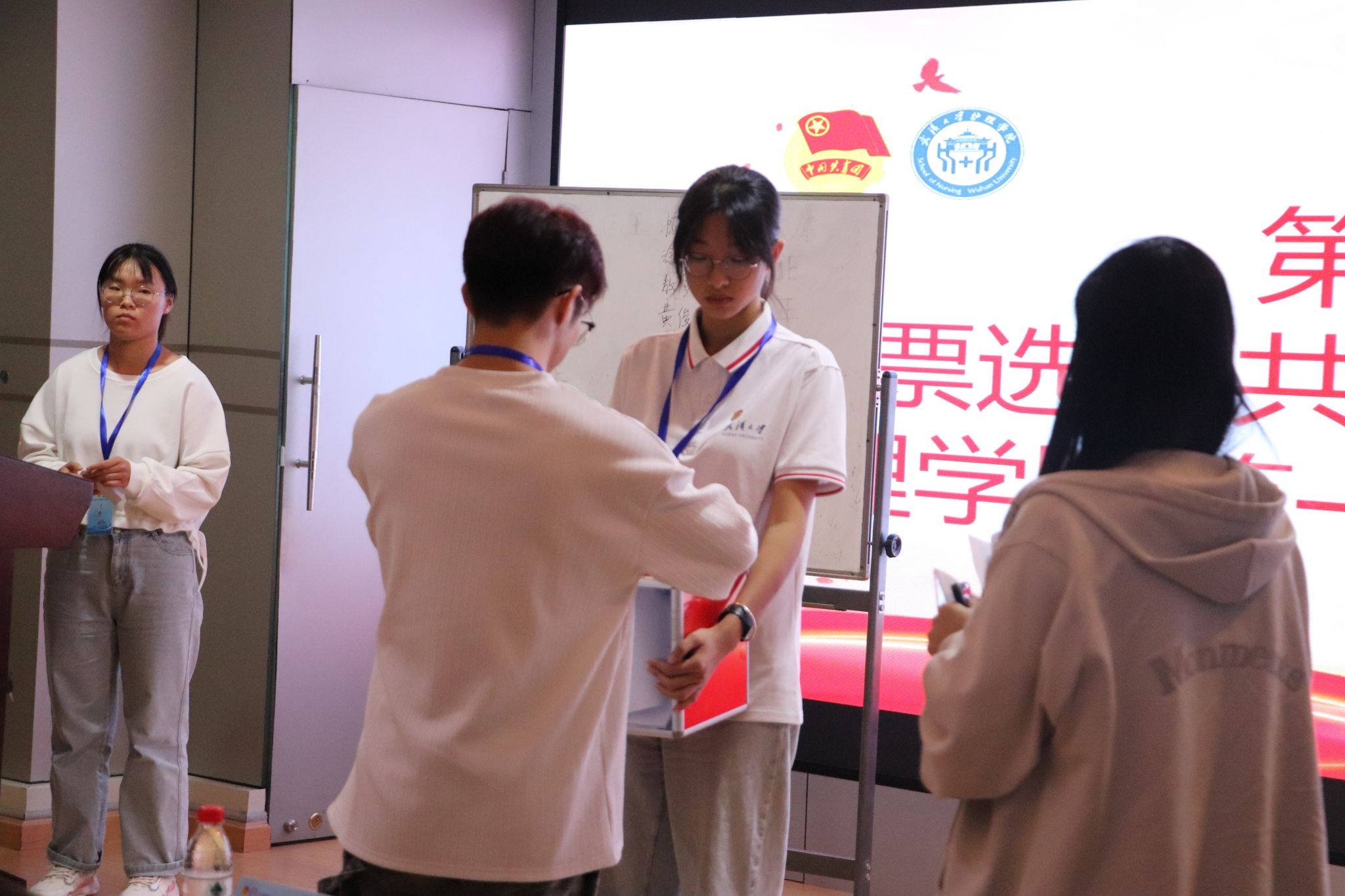第一次代表大会总监票人、监票人、计票人名单(草案)》,代表分团审议委员候选人材料后,由大会主持人胡静怡同学主持投票环节,以无记名投票方式选举产生共青团抖阴