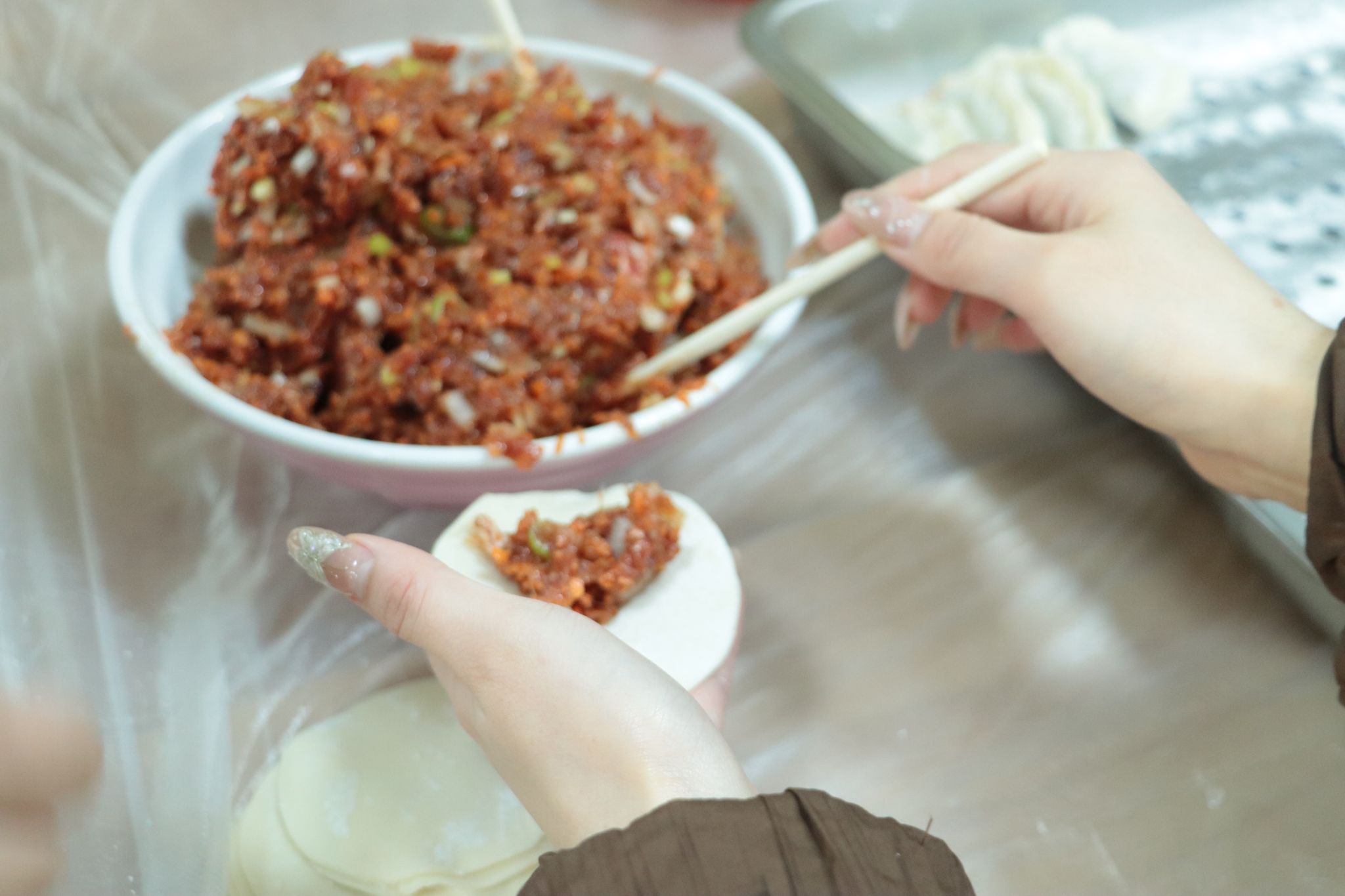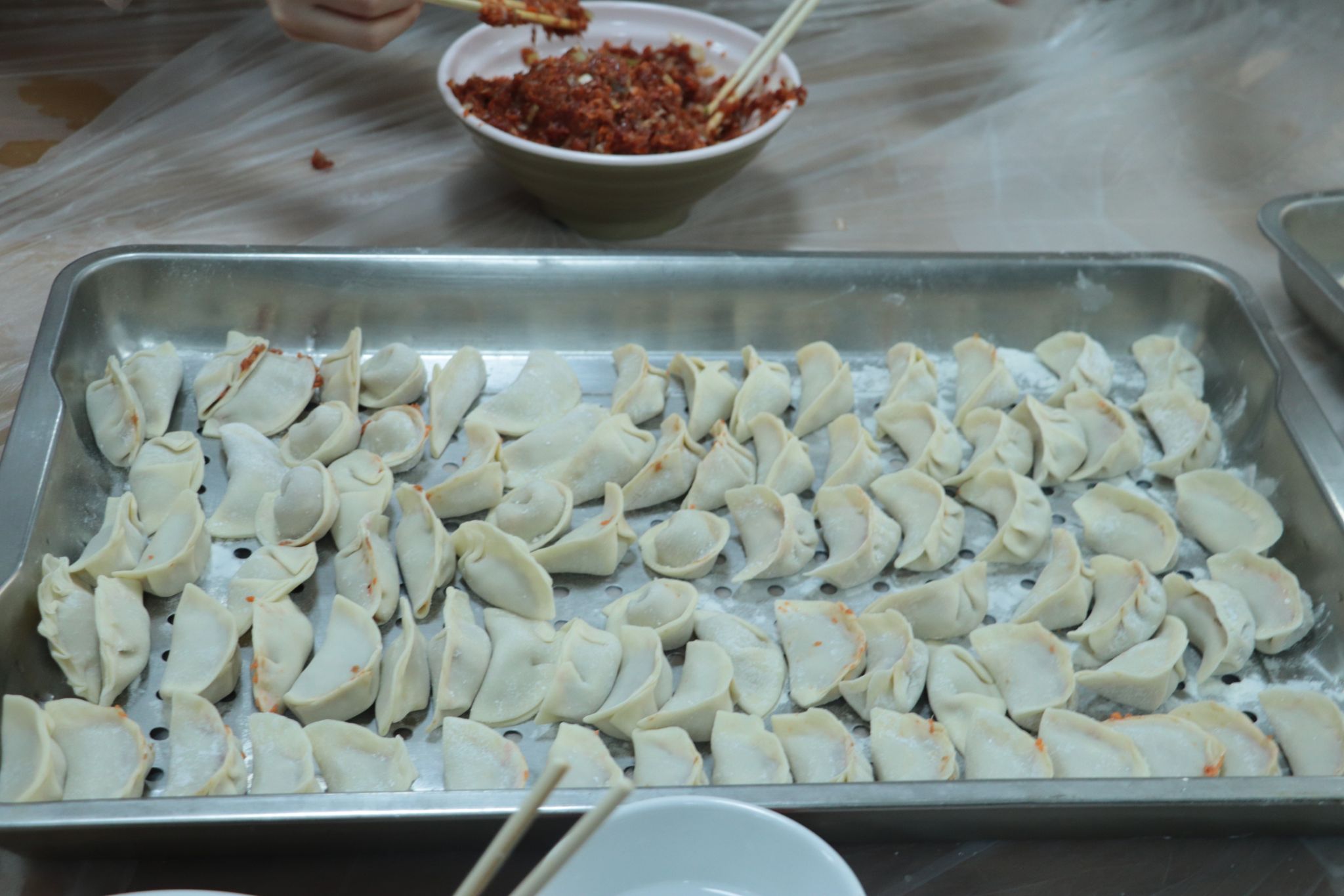 长桌前,老师同学们摩拳擦掌,准备向身边的同学展示来自家乡的包饺子手法。面皮、肉馅、灵巧的双手,一只只形态各异、充满着不同地域风情的饺子整齐排列在餐盘里。其中,有来自北方的大元宝、来自南方的花饺子、还有同学们精心创作的三角形饺子、小笼包形饺子等等。包饺子的过程中,欢声笑语不断,传递着美好的情感与祝福。
