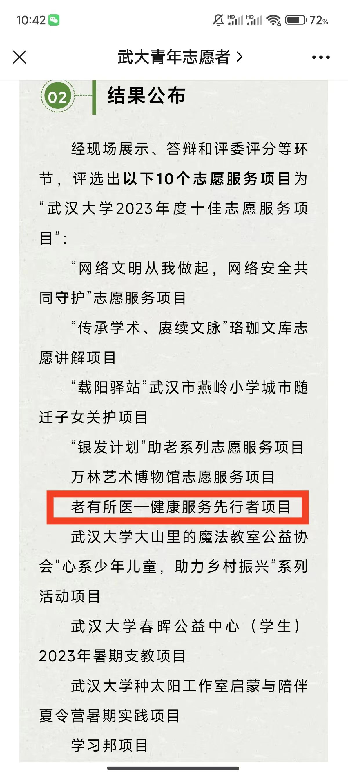 (通讯员 李珂)近期,抖阴 天使之翼社团在取得“2023年度湖北省本禹志愿服务队”称号后,又凭借“老有所医—健康服务先行者”项目荣获“抖阴 2023年度十佳志愿服务项目”!