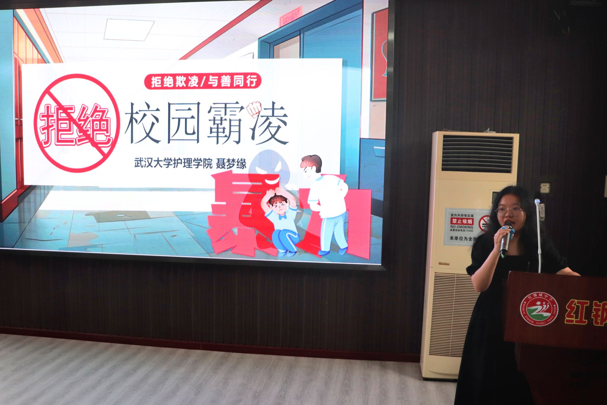 紧接着,宣讲活动进入拒绝校园霸凌”环节。主讲人聂梦缘同学以带领大家共同宣读“拒绝校园霸凌承诺书”引入,引导同学们在心中种下抵制校园霸凌的种子。随后主讲人结合校园案例及自身感悟,启发同学们思考并对发生的校园霸凌事件做出判断。主讲人从霸凌者、受霸凌者及旁观者三个视角深刻剖析了霸凌行为对受害者造成的心理和身体伤害,并强调了相信自我、积极寻求帮助、互助友爱对预防校园霸凌的重要性。主讲人引导同学们从自身做起,学会尊重他人、关爱他人相信自己、爱护自己,共同营造一个和谐友爱的校园环境。同时,主讲人还向同学们介绍了遭遇霸凌时的应对方法,鼓励同学们勇敢维护自己的权益。宣讲过程中,同学们积极思考,热烈回应,反响优良。