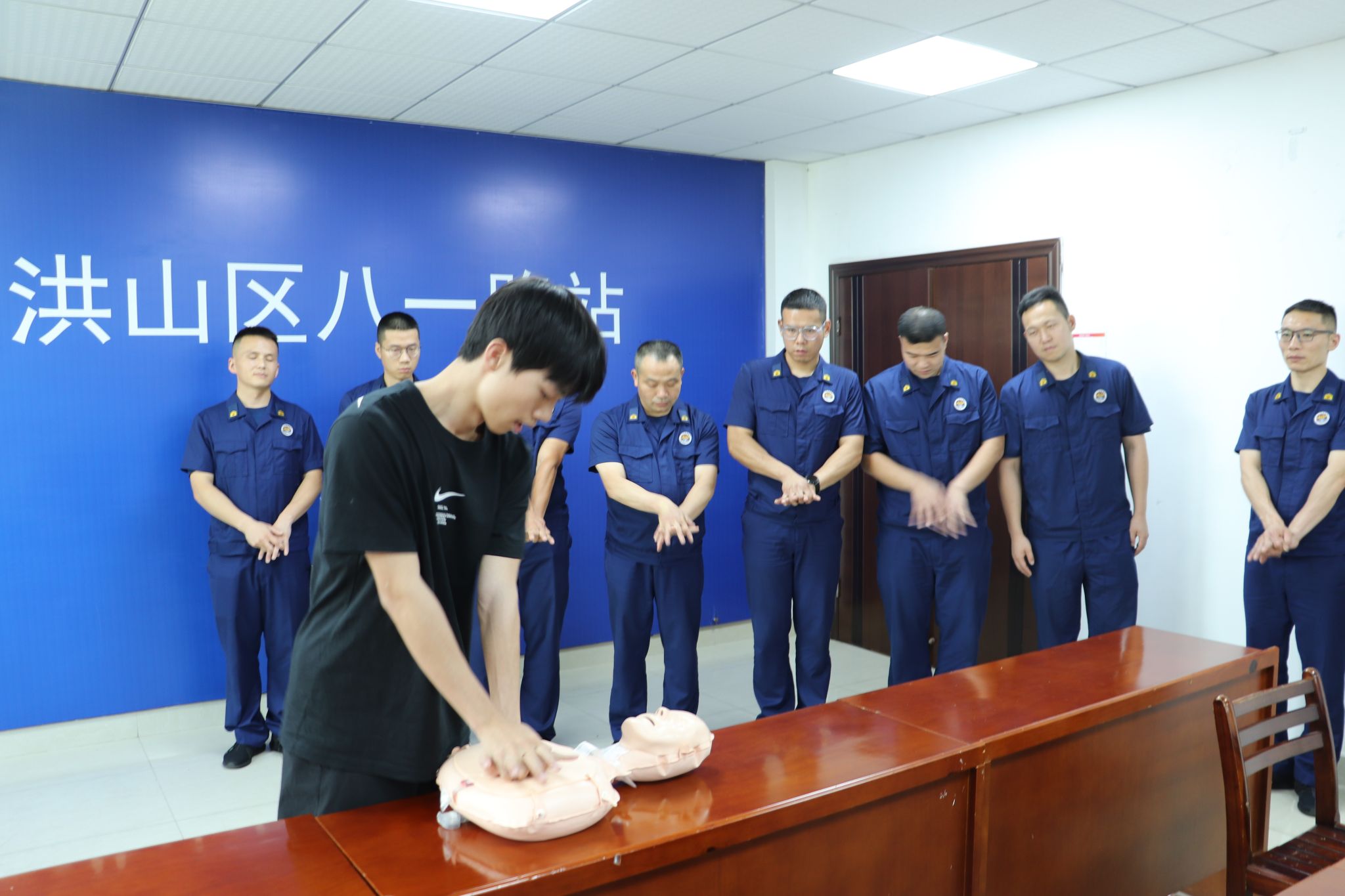 吸收完消防员教授的消防知识后,同学们也发挥专业优势,为消防员们开展了一堂有关心肺复苏(CPR)的模拟实操课。首先,唐姿燕同学详细地介绍了CPR的重要性、操作步骤与注意要点,随后由易曾堂同学为消防员进行CPR实操演习,全方位展示包括判断心脏骤停、正确的按压位置和手法在内的多项关键技能。为了进一步加强消防员对CPR的了解,提升他们的急救能力,同学们还邀请消防员根据所学内容上前进行实操。消防员们纷纷表示学习CPR可以为他们提供更多紧急救援支持。