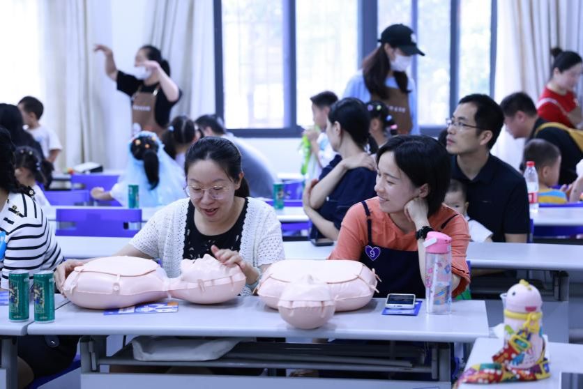 张旭老师借助人体模型教具,详细示范了心肺复苏术的操作步骤。培训内容从胸外按压的正确节奏和深度,到人工呼吸的技巧,一一细致讲解。随后,志愿者们耐心地指导家长们进行实操演练,帮助他们掌握心肺复苏的正确方法。通过手把手的指导,家长们逐步掌握了这一关键急救技能,增强了应对危机状况的能力。