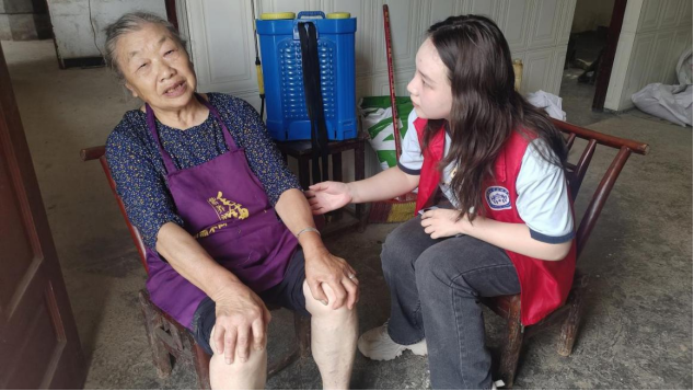 为期三天的实践中,健康知识宣传也是实践队员们的重要任务。实践队员们分成小组,走进村民家中,对老年人进行健康评估和筛查。队员们一边仔细填写问卷,一边与老人们亲切交谈,了解他们的健康状况、生活自理能力和心理健康情况。调研过程中,队员们访谈了一位79岁的奶奶,她患有高血压和类风湿关节炎,这些疾病让她在日常生活中行动不便,需要依靠拐杖。尽管疾病缠身,这位奶奶仍然保持着积极乐观的生活态度,通过参与社区活动和与邻居交流,努力克服孤独和疾病的困扰,老人的坚强品质让实践队员们为之动容。