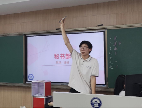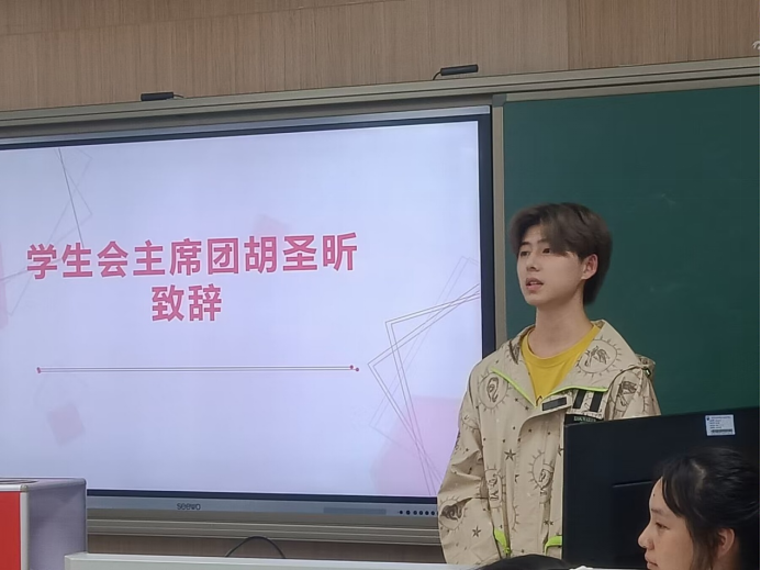紧接着学生会主席胡圣昕进行发言。他表达了对团学新人的热烈欢迎,并次见面会能够圆满成功。