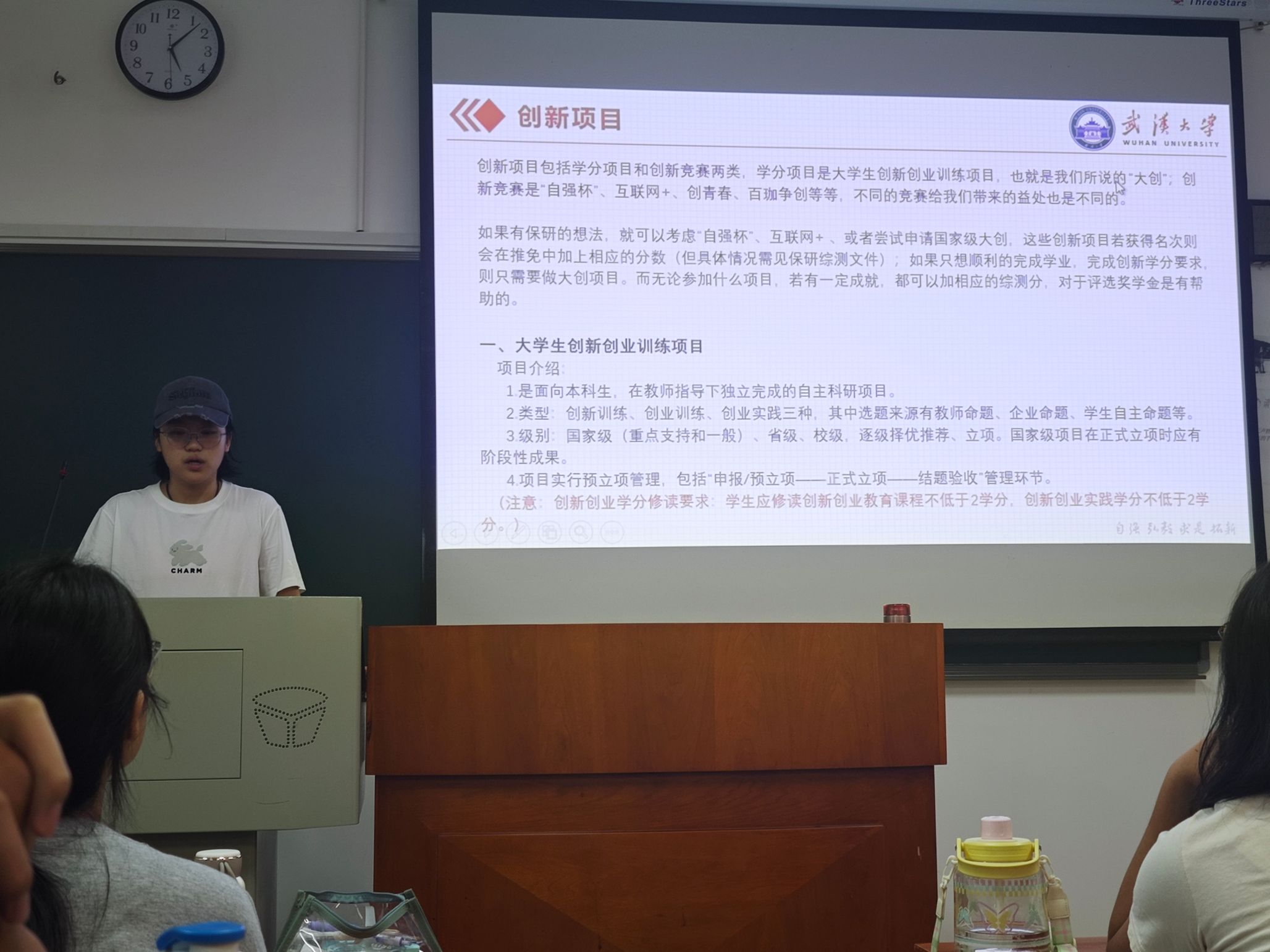23韦清妍学姐结合培养方案对创新创业的要求,详细讲解大学生创新创业项目以及“挑战杯”“互联网+等科创赛事要求。她向同学们传达了学院积极鼓励同学们参加科创竞赛的精神,分享了自己的科创竞赛经验,建议同学们及早联系导师,在参加比赛中提升自己的科研素养,为日后的发展做好准备。