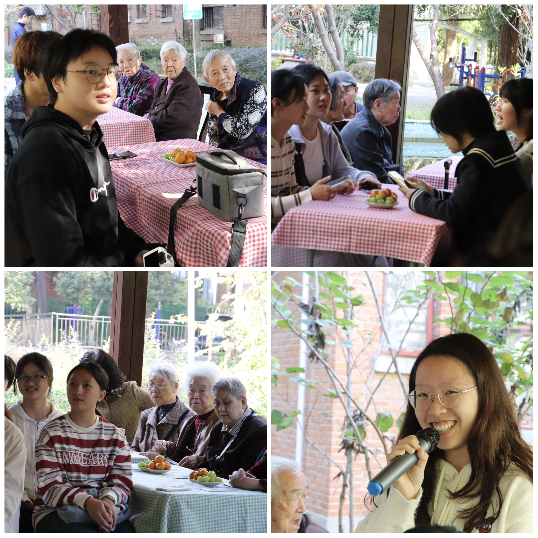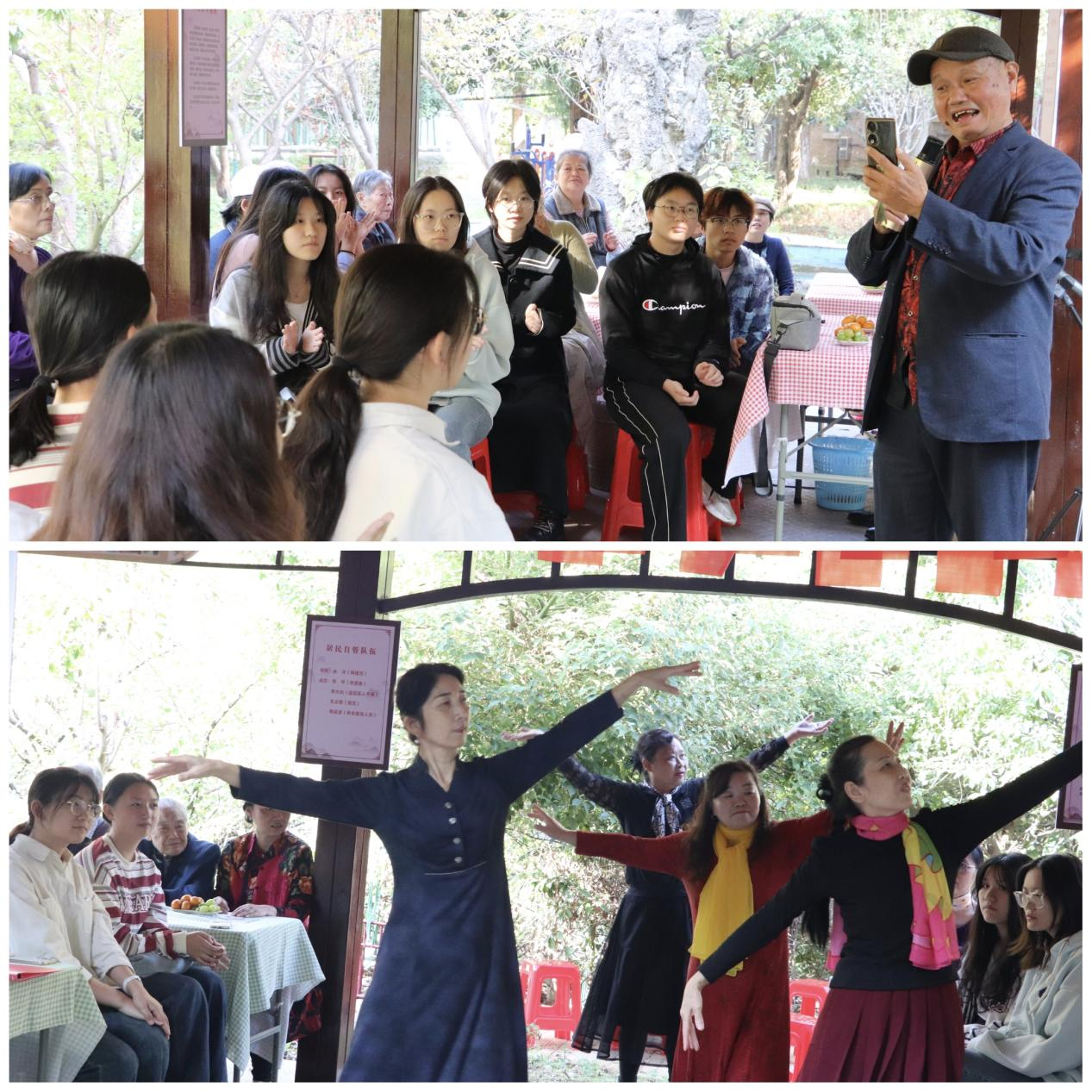 除了社区爷爷奶奶的倾情表演外,天使之翼志愿服务队的队员们也精心为爷爷奶奶们准备了惊喜小节目。梅诗琪和陈心怡同学唱响《最炫民族风》,活跃现场气氛。陈誉鑫和朱莎莎同学一曲《荷塘月色》引的一位奶奶现场为她们伴起舞来,贡献了一次惊喜的合作舞台。刘雪茹、吴婧、韦清妍、穆睿怡四位同学合作曲目《爱》,尽显青春活力,现场互动也变的精彩起来。值得一提的是,抖阴 相声小品协会成员赵康凯、张焯然同学带来相声节目《关公战秦琼》精彩亮相,两人配合默契,一唱一和逗得现场掌声连连,爷爷奶奶们纷纷拍手叫好。
