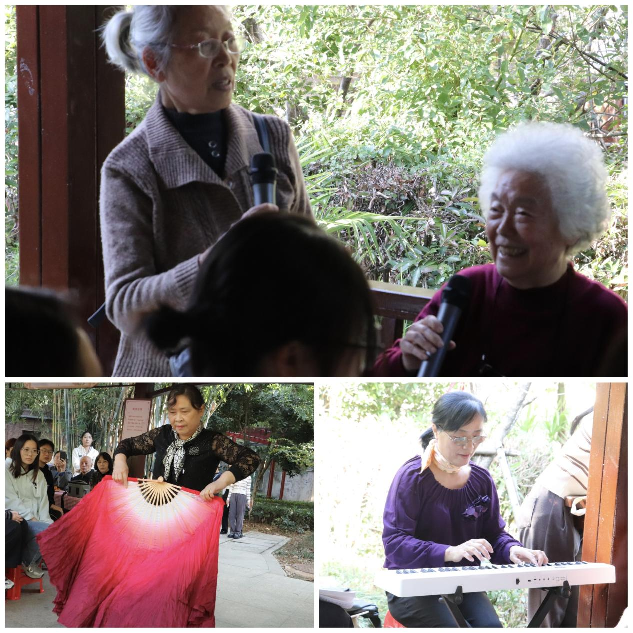 接下来就是生日会的文艺表演活动了。社区老人蔡爷爷以一首《草原之夜》震撼开场,歌声悠扬嘹亮,熊奶奶带来电子琴乐器,现场演奏起《生日快乐歌》引得全场大合唱。随后,张奶奶带来舞蹈合作秀《娥曼》,刘奶奶带来长扇独舞《五星红旗》。最后官奶奶和姜奶奶合作演唱《革命人永远是年轻》,祝福社区老人们永远年轻,幸福如初。在音乐与舞蹈的氛围烘托下,在欢笑与掌声中,大家脸上都露出最真诚的笑容,志愿者们仿佛看到了爷爷奶奶们年轻时的青春故事,永远是那么热烈美好,浪漫自由……