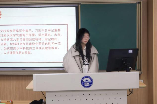 接下来,团委成员张雨婷带领大家共同学习了学校第十次党代会的重要精神,同学们深受鼓舞。作为新时代的武大人,要始终牢记殷殷嘱托,砥砺担当之志,坚持不懈在强国建设中锤炼过硬本领,坚定不移在科技自立自强中引领创新发展,奋力书写新时代火热的珞珈青春篇章。