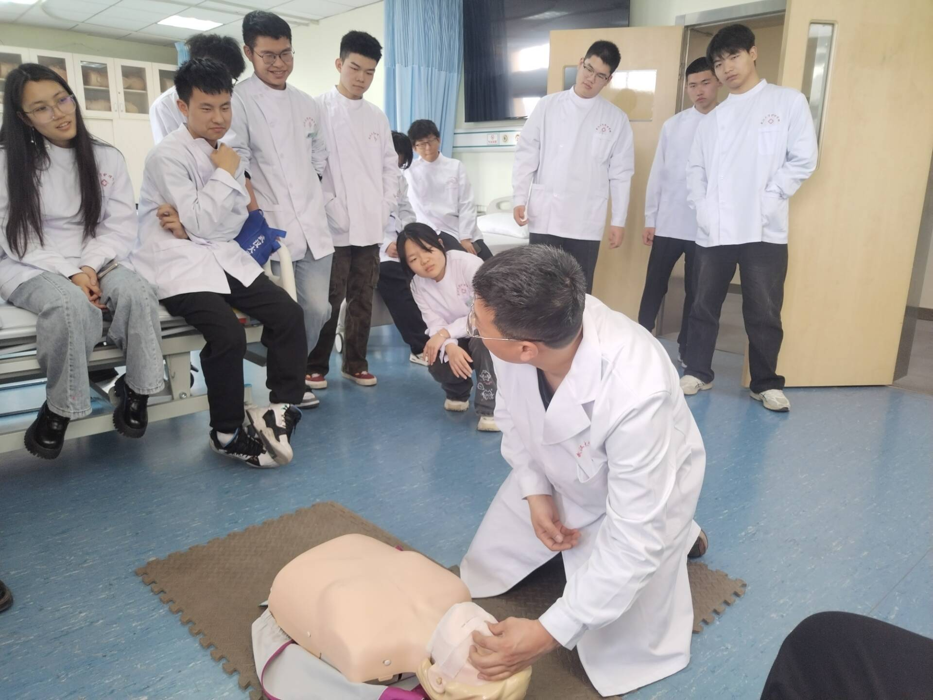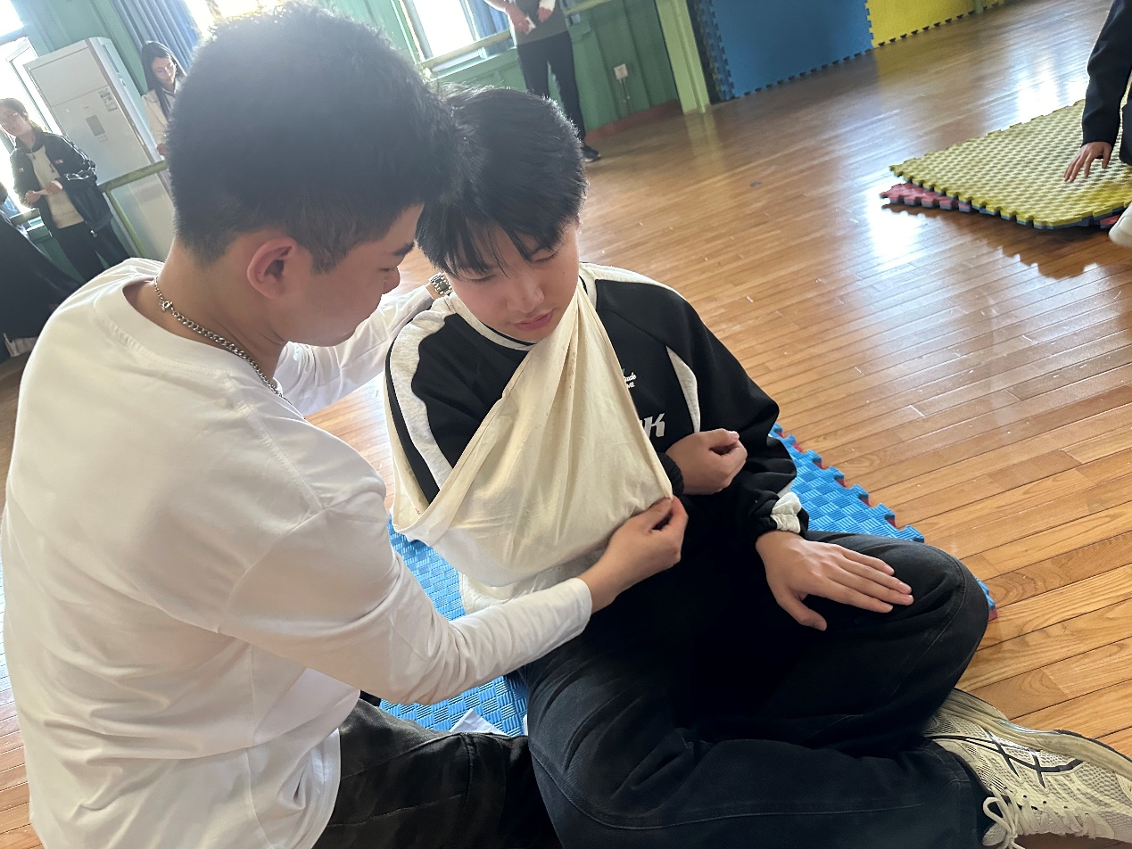 随后,团支书带同学们进入抖阴 综合模拟实验室。张旭老师详细讲解了止血带绑扎、骨折固定、CPR等急救技能,并亲自示范。同学们听后跃跃欲试,立即投入实践。在老师指导下,大家力求动作标准,不仅加深了专业知识理解,还锻炼了应急处理能力,为情景剧推进做好了准备。