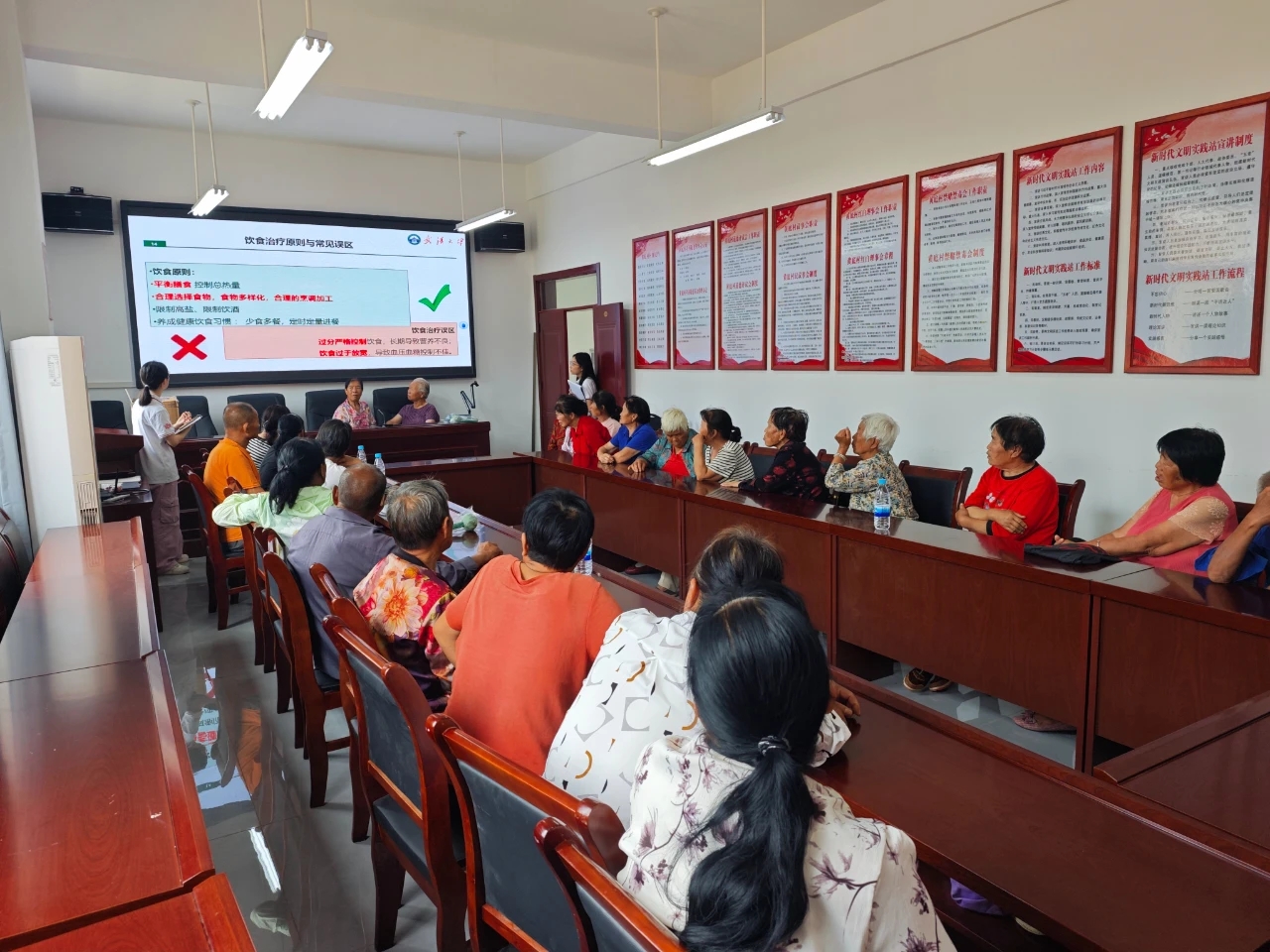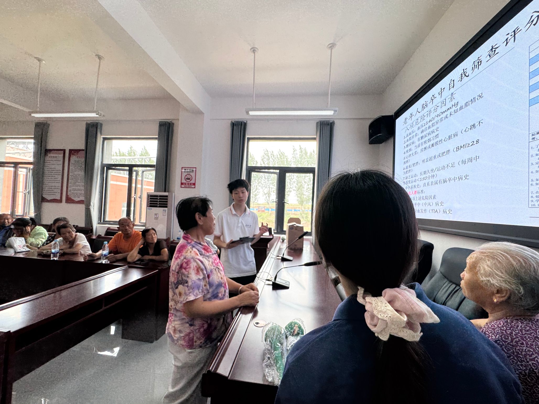 为提升村民健康素养,实践队在村党员活动室组织开展了健康知识科普讲座。讲座内容涵盖“两癌”筛查的重要性与流程,以及高血压、糖尿病、脑卒中等常见慢性病的科学防治知识,吸引了40余名老年村民踊跃参与。宣传结束后,队员们为村民进行血压和血糖测量,并将测量数值记录在手册上面,积极引导大家关注自身健康。此外,队员们还实地参观了村卫生室,与村医进行深入座谈交流,详细了解了基层医疗卫生服务的运行现状及“两癌”筛查政策在乡村的落实情况。