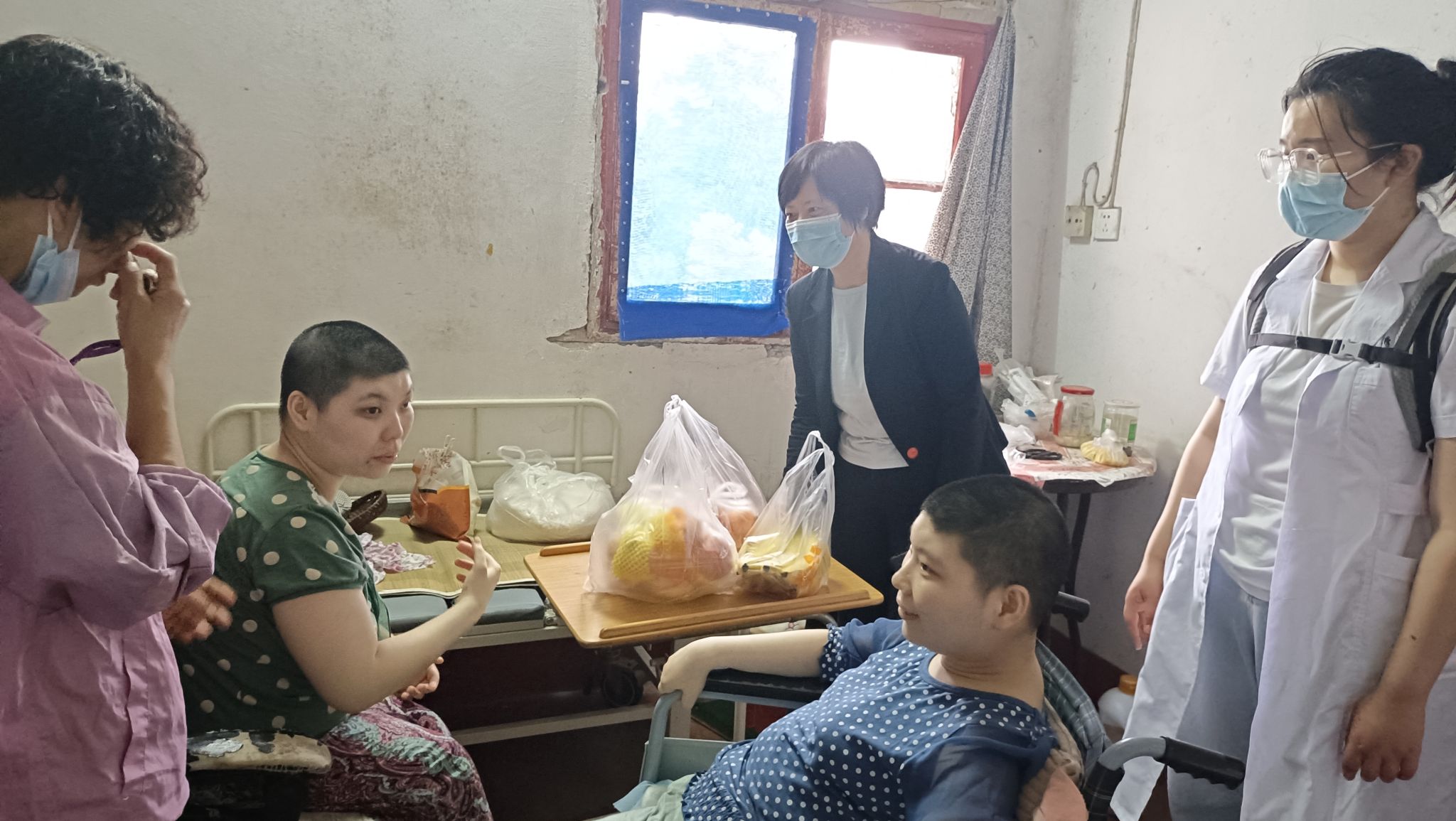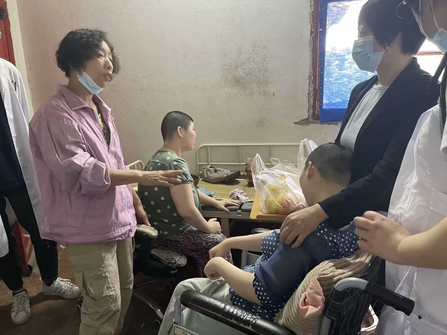 我们为双胞胎家庭带去了实用的礼品,在简陋的小屋中对姐妹二人进行了一番亲切的问候,母女三人对于我们的到来和关切的问候肉眼可见的激动和喜悦。尤其是姐妹二人在发现余老师后,都想争夺余老师的怀抱。在家庭访问时,母亲向同学们介绍了他们的生活情况。她说,尽管照顾脑瘫患儿需要付出更多的努力和时间,但她们家庭“和睦温馨,充满爱”。在同学们与母亲以及双胞胎姐妹充分地交流后,同学们在余老师的指导下简单评估了她们目前的健康状况和情绪状态。姐妹二人都十分开朗乐观、积极向上,虽然姐妹二人有时会出现不正常的姿势和运动,但在发现她们会做握手、拥抱、擦拭鼻涕等动作时,同学们给予了鼓励和赞扬。看到她们拖着残疾的身躯,身处于如此贫困艰苦的环境中却还能如此乐观向上,大家不禁都湿了眼眶。