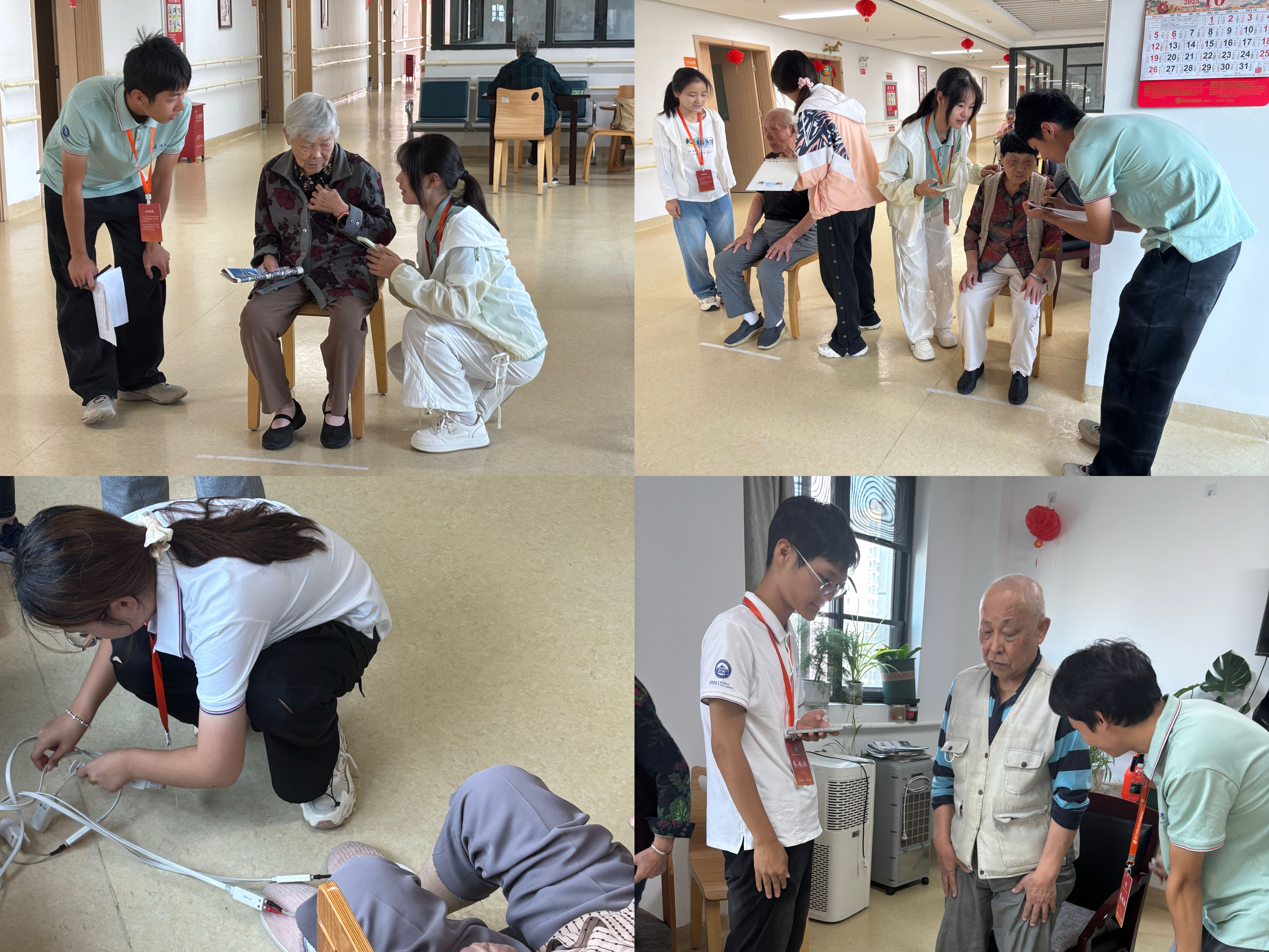 10月3日上午,同学们赴洪山区养老院,在了解老人身体状况的同时,与老人交流,倾听他们的人生故事与烦恼。10月7日全天,大家又前往江汉区养老院,将爱意延伸给更多的长者。面对连续服务的辛劳,同学们未曾停下脚步,始终以热情与耐心完成健康评估及情感陪伴。活动提供专业支持,聚焦老年人口腔衰弱与肌少症筛查:通过5次起坐、计时起立行走(TUG)、6米步速测试,评估老人下肢肌肉力量、平衡及步态稳定性;借助INBODY人体成分分析仪检测下肢肌肉质量,结合体重、BMI判断营养不良情况;同时通过面对面问卷,系统调研老人口腔功能、睡眠质量及心理健康,为早期干预、延缓口腔衰弱、提升肌肉健康提供依据,助力老人安享晚年。