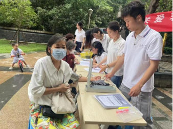 623日早上9,在得到提前联系的社区物业人员的帮忙下,工作很快就开始正式展开。实践队的伙伴们早早来到了活动现场热情高涨,积极布置场地、分发材料并广泛宣传,前来免费测量血压及咨询的路人络绎不绝。在短短的一个小时内,测量血压的中老年社区居民就有几十人,队员们耐心地给爷爷奶奶进行饮食、运动指导,了解老年人对老化的态度,讲授认知症基本知识