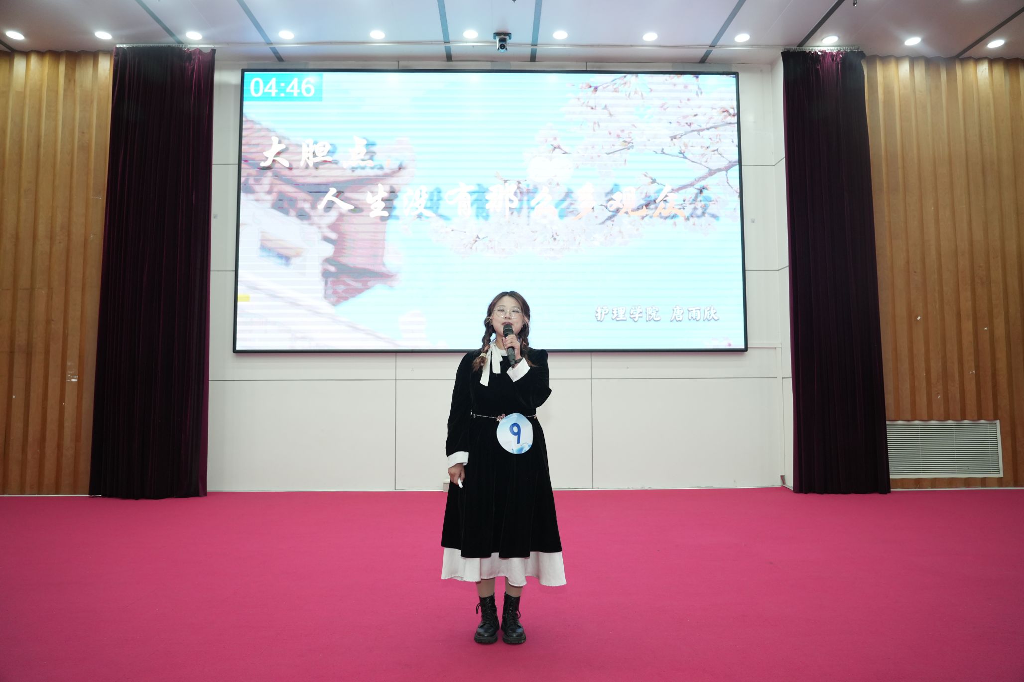 唐雨欣以《大胆点,人生没有那么多观众》为题,讲述了自己用课余兼职积攒的钱,独自从驻马店前往长白山的旅行经历,途中经历了长途火车颠簸、严寒天气、初学冰爪摔跤及哈尔滨冬泳等挑战。她结合旅行与学习生活,分享了突破自我、战胜胆怯的感悟,呼吁同学们放下顾虑、接纳不完美,大胆追求目标。