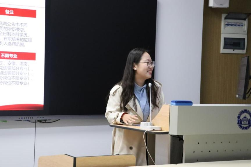 杜祎鑫首先介绍了选调生政策内涵与选调流程。强调选调生是国家为加强党政干部队伍建设、优化干部来源结构而实施的重要人才工程。她提到选调生不同于普通公务员考试,其核心在于选拔政治素质过硬、综合素质突出、有志于基层服务的优秀应届毕业生,通过基层锻炼培养未来党政领导干部。