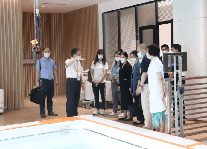 在楚园康复医院院长尹家保的带领下,周芙玲等一行人依次参观了楚园的康复医院门诊、护理单元以及养老社区。参观过程中,尹院长详细介绍了医院高压氧疗技术、OT治疗、水疗等医疗技术及其功效。尹院长表示,医院还非常重视老年人的心理健康,专门设置了活动室,安排特色的老年活动,老年人可以通过音乐演奏、歌唱、篮球、下棋等活动发挥特长,加强彼此之间的交流交往。