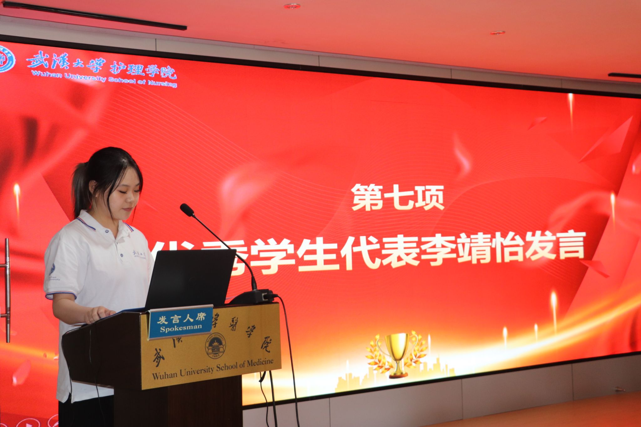 中南医院殷磊与优秀学生代表2021级本科生李靖怡发言。两位临床带教老师结合自己切身的带教经历,陈述了自己对师德一词的理解,21级本科生李靖怡代表全体学生向所有教师表示衷心谢意并祝以真挚的节日问候。