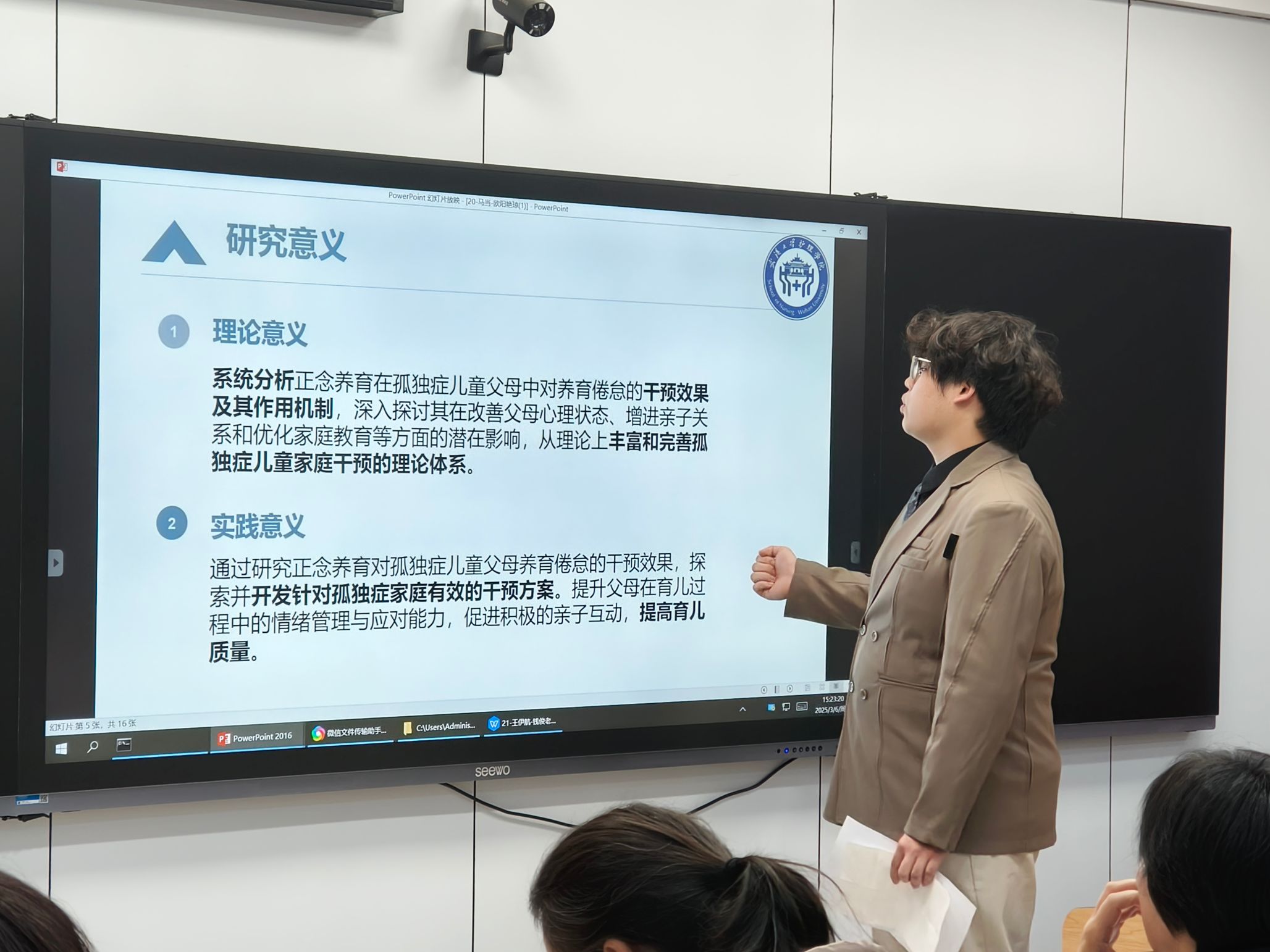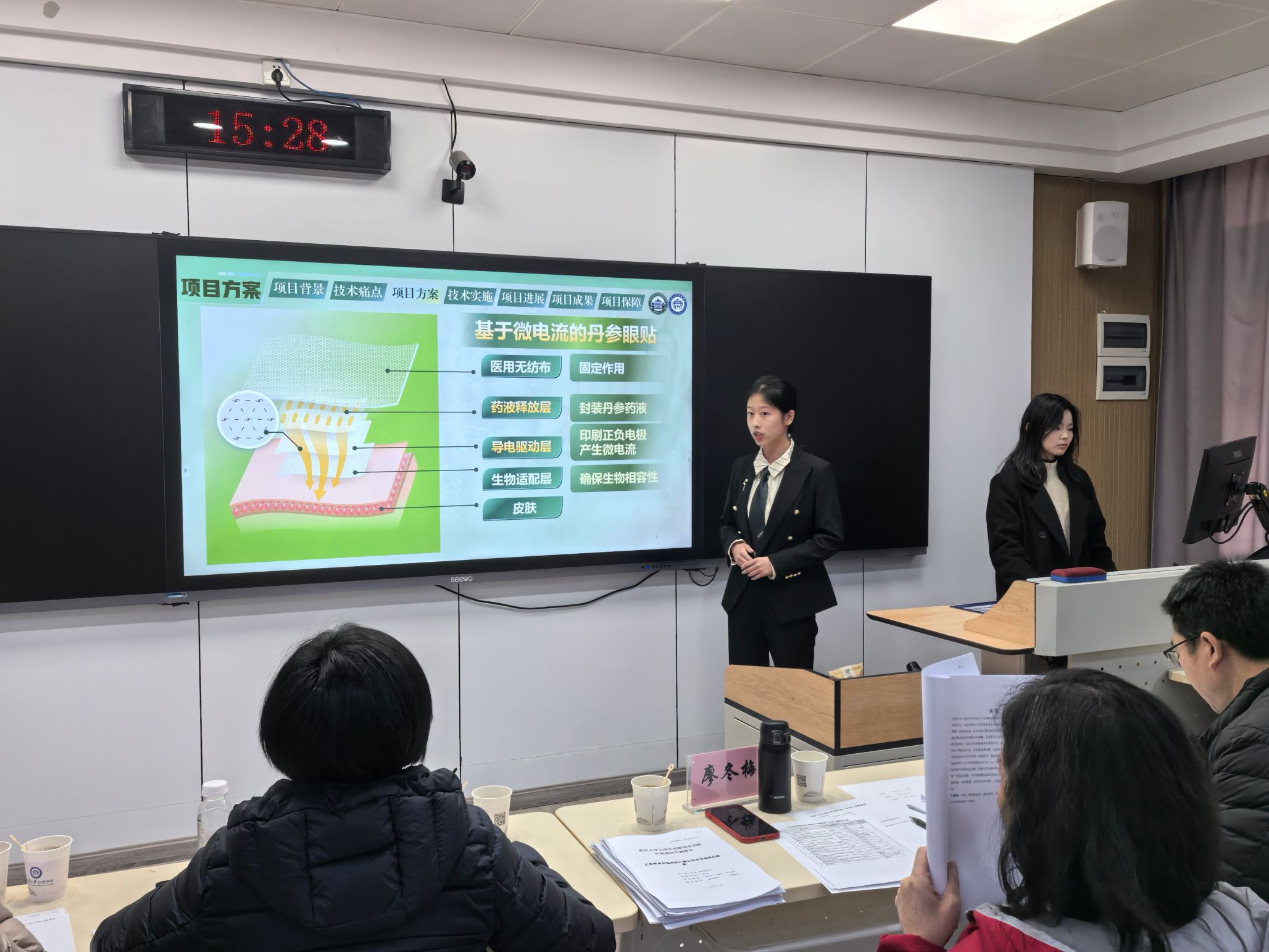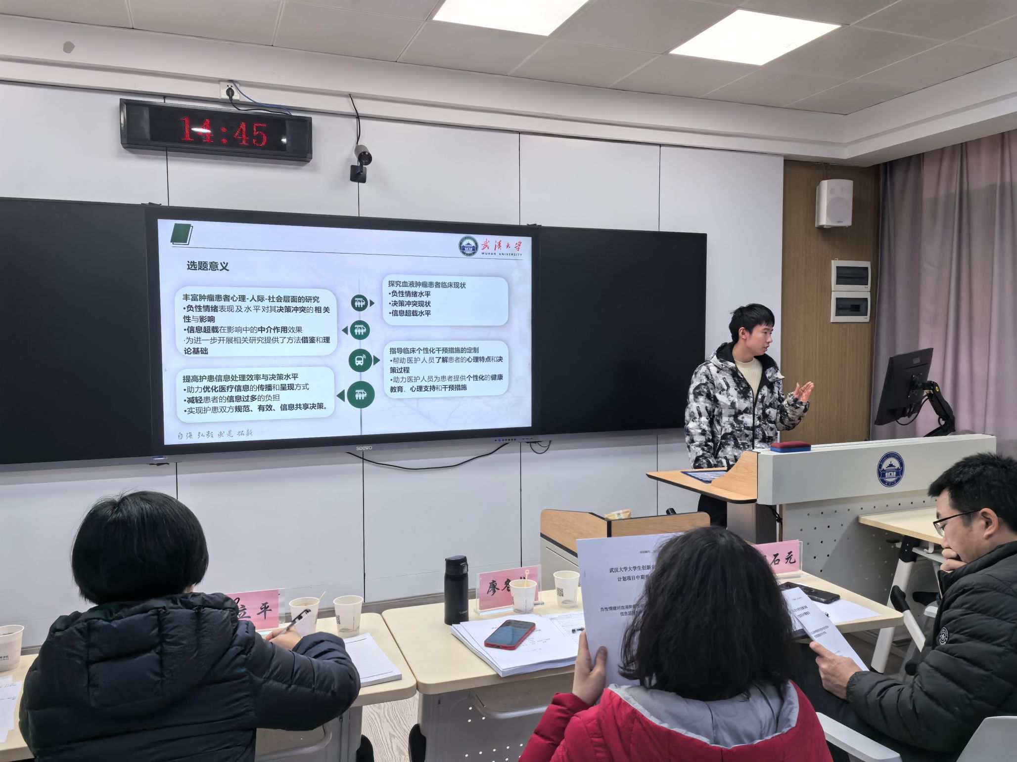 本次答辩会共有34支学生团队参与,每支队伍依次进行限时4分钟的PPT展示,并接受评委3分钟的提问与点评。团队围绕研究背景、理论依据、研究方案、项目进展、实施情况、项目保障、预期成果等方面展开汇报。各团队项目选题紧扣社会需求,内容结构严谨、逻辑清晰,充分展示了护理学科在跨学科融合、科技创新和社会服务等方面的无限潜力。此次答辩不仅是对学院大创项目阶段性成果的全面检阅,更是一次学生创新创业能力的集中展示。