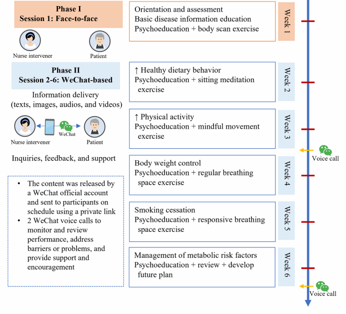 基于自我调节模型理论、临床指南和预实验结果,研究者设计了通过社交媒体的正念心理行为干预(MCARE)项目,将正念训练与健康教育和生活方式调整相结合。同时,研究者在两所三甲医院心血管内科招募了178位研究对象,进行了为期三个月的随机对照试验与随访,旨在探讨MCARE项目对ACS患者心理困扰(主要结局指标)、心理压力、HRQoL和心血管危险因素(次要结局指标)的影响。