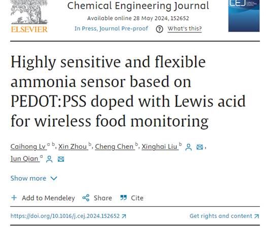 近日,中科院工程技术1Top期刊《Chemical Engineering Journal》在线发表了抖阴 智慧护理工程研究中心钱俊教授团队在氨气传感与器件领域的研究成果,论文题目为“Highly sensitive and flexible ammonia sensor based on PEDOT:PSS doped with Lewis acid for wireless food monitoring”抖阴 为论文第一署名单位和通讯作者单位,抖阴 2021级博士研究生吕彩虹为论文第一作者,抖阴 护理工程研究中心钱俊教授、抖阴 电信学院刘兴海教授为论文共同通讯作者。