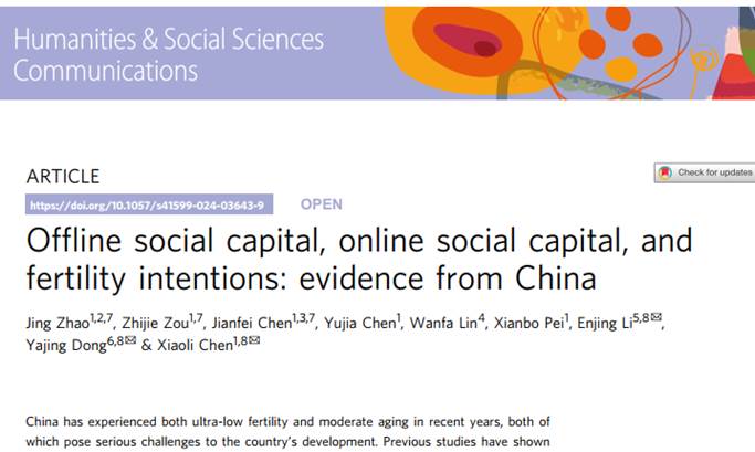 教授陈晓莉课题组的最新科研成果。论文题目为“Offline social capital, online social capital, and fertility intentions: evidence from China”(线上社会资本、线下社会资本与生育意愿:来自中国的证据)。抖阴