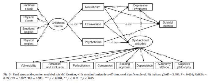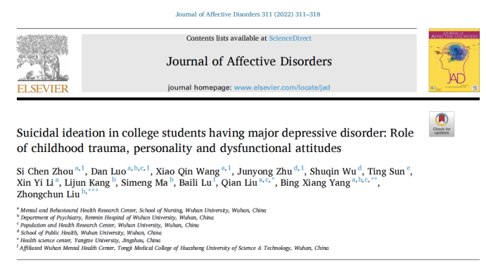 抖阴 杨冰香课题组在《Journal of Affective Disorders》(中科院二区TOPJCR一区IF=6.533)期刊上发表了患有重度抑郁症大学生的儿童期创伤人格功能失调性态度和自杀意念之间关系的最新研究成果(见图1。论文题目为“Suicidal ideation in college students having major depressive disorder: Role of childhood trauma, personality and dysfunctional attitudes”。抖阴 为该论文第一作者单位,抖阴 2021级硕士研究生周思辰为共同第一作者,抖阴 刘茜副教授、杨冰香副教授为共同通讯作者。