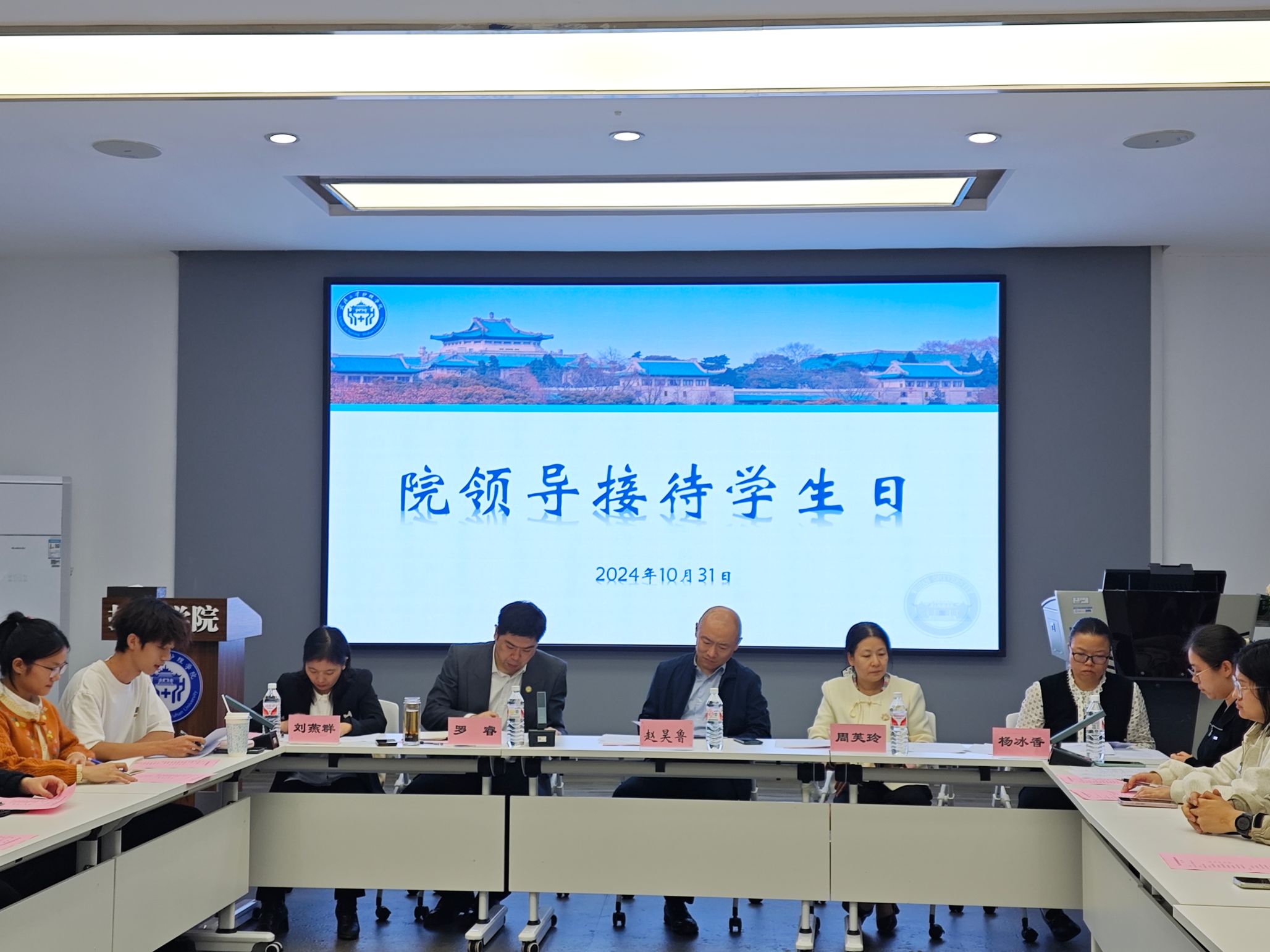 党委书记赵昊鲁、院长周芙玲、党委副书记罗睿、副院长杨冰香、副院长刘燕群出席接待日活动,学生会和研究生会代表以及部分本科生和研究生同学代表参加活动。会议由院党委副书记罗睿主持。