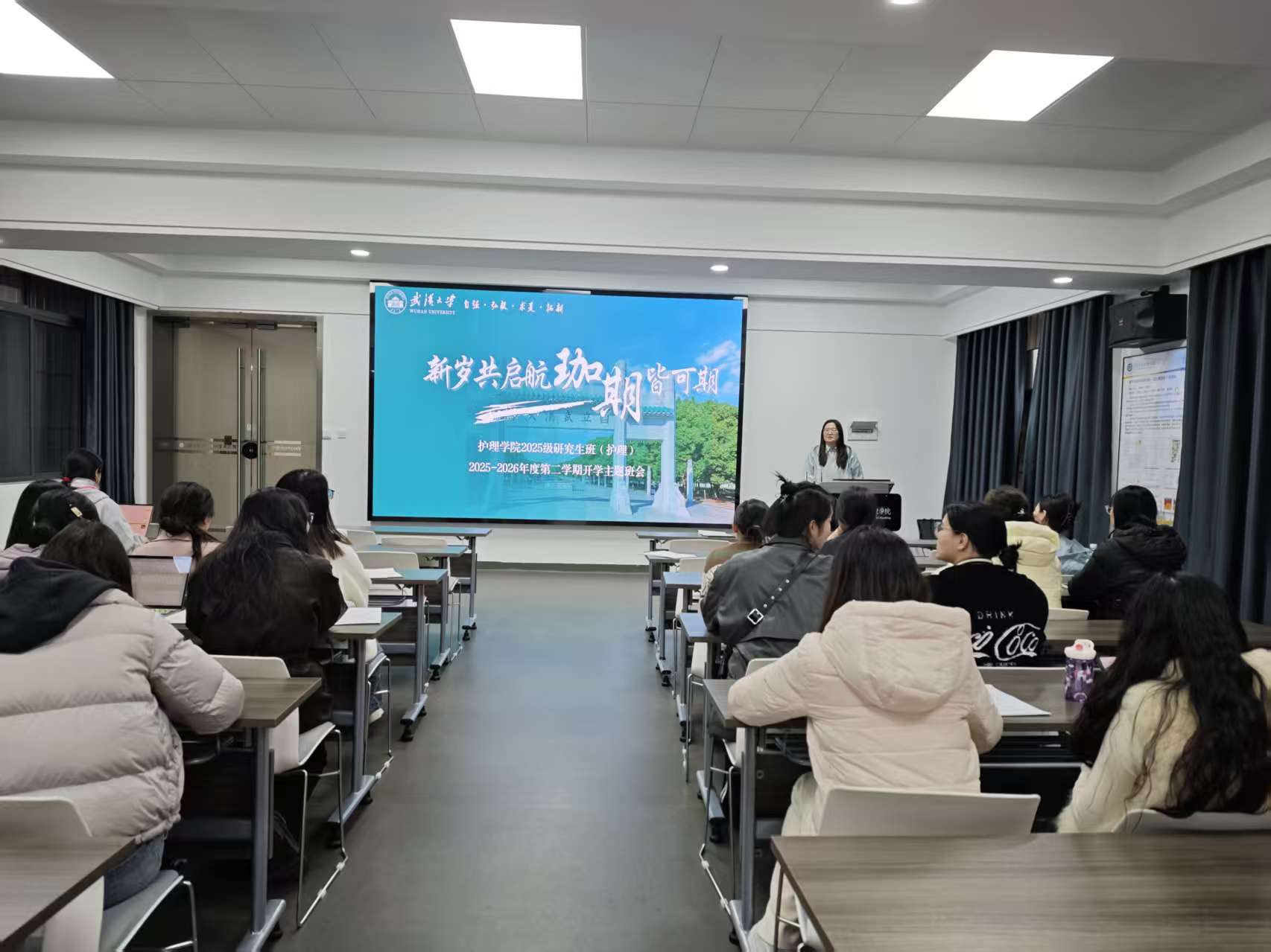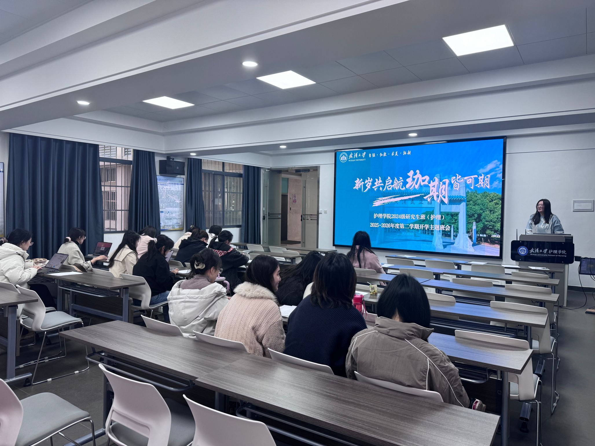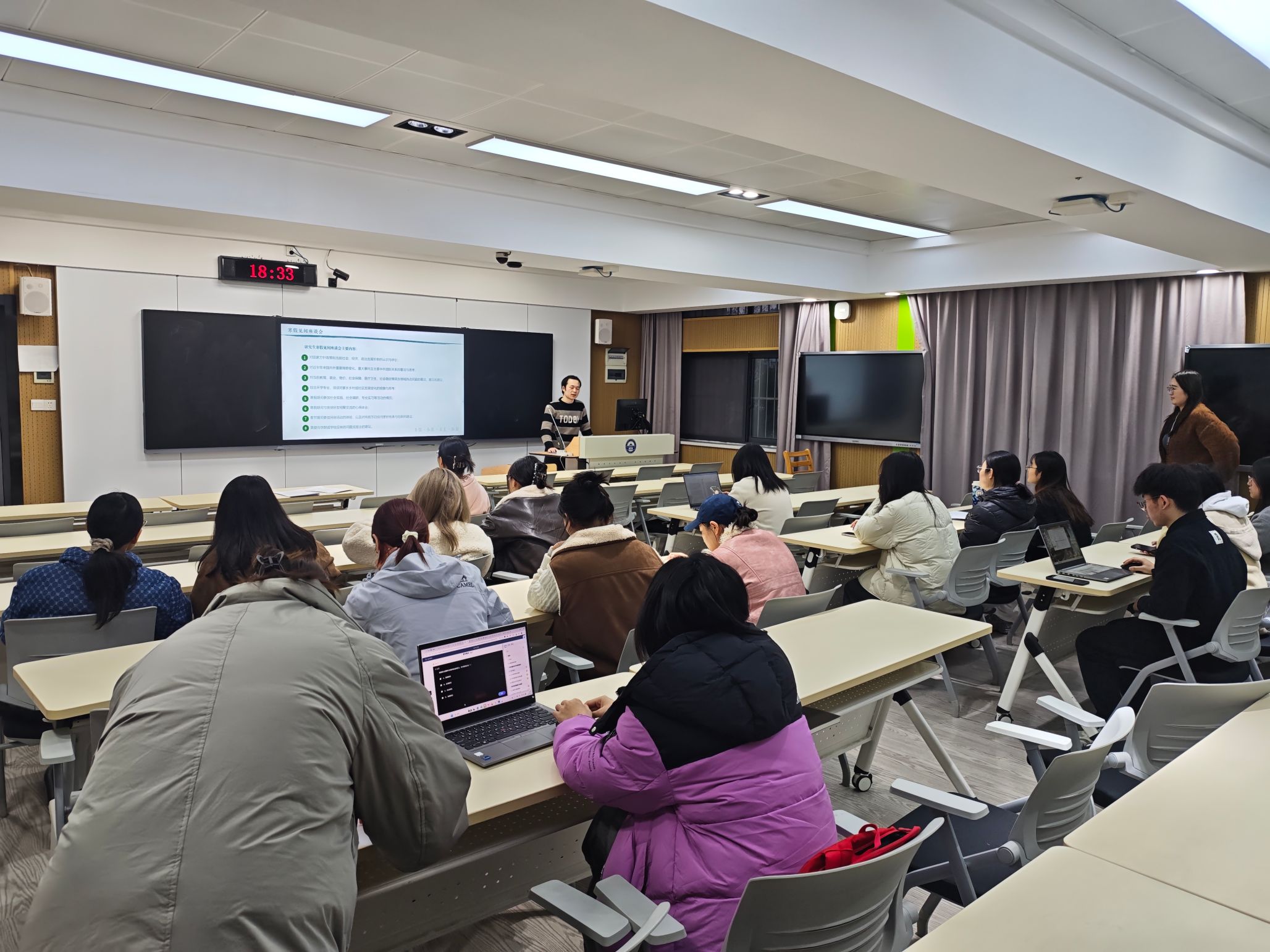 于3月9日至3月11日分批次召开新学期主题班会暨寒假见闻分享会,实现全体研究生班级全覆盖。辅导员毛诗柔参加会议,与同学们齐聚一堂,共话寒假见闻、共研新学期计划、共守校园管理要求。