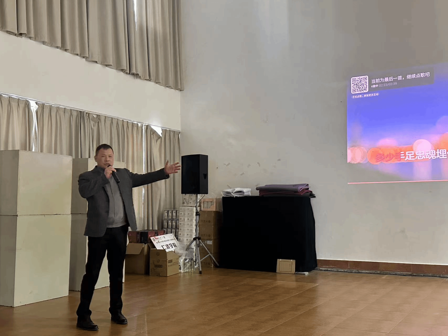 本次比赛的参赛歌曲种类丰富,包括了中文和英文歌曲,涵盖了流行、经典、民谣等多种风格。每位选手都用自己独特的风格演绎了不同的歌曲,赢得了观众们的热烈掌声和喝彩。参赛者赵建中老师用他独特的嗓音,充满力量与激情的演唱了《精忠报国》,赢得了满场掌声。王在韬老师演唱的英文歌《My love》深情动人,引起了大家的共鸣。王筱玮老师带来的歌曲《一起摇摆》节奏轻快,语言流畅,现场观众不自觉地一起舞动摇摆。还有许绍哲和焦倩倩老师共同演唱的老歌《知心爱人》,旋律悠扬,情感真挚,观众们发出阵阵喝彩声。无论是激情四溢的歌曲,还是柔情似水的演绎,大家都尽情地投入到这场歌唱盛宴中。平日里在运动场上挥洒汗水、传授体育知识的他们,此刻化身为舞台上的 “歌者”,用歌声传递情感,用旋律展现自我。活动现场气氛热烈,高潮迭起,除了精彩的歌唱比赛外,还穿插了击鼓传花的趣味游戏,让整个活动充满了欢乐与惊喜。