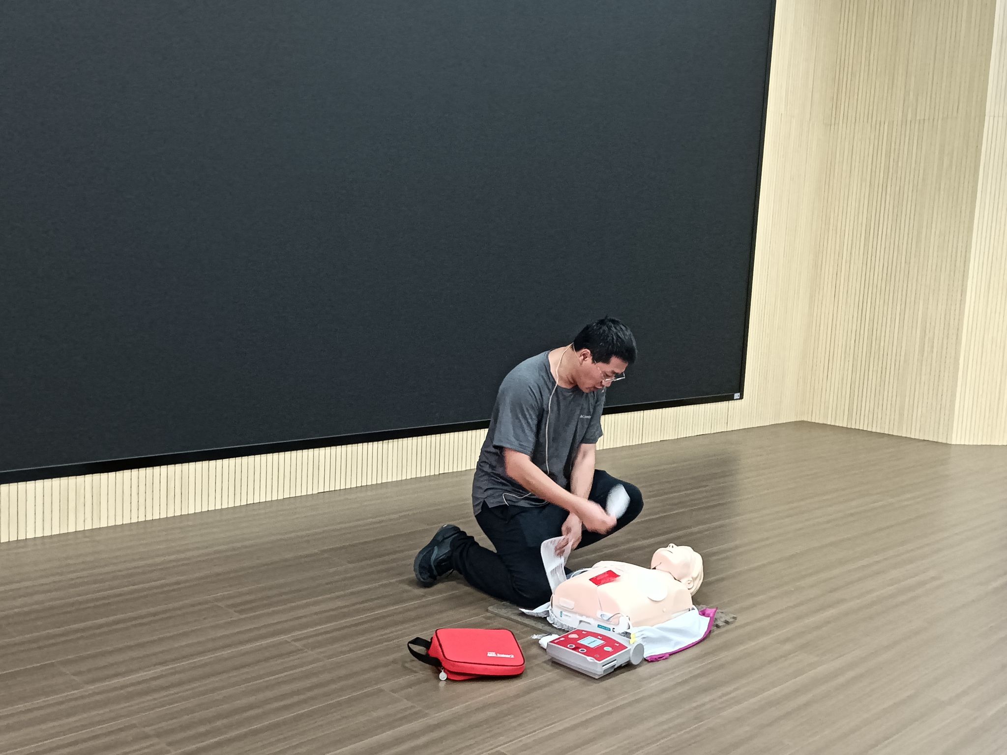 接下来,张旭老师进行了现场演示,包括徒手心肺复苏术和AED操作等。同学们在演示结束后纷纷踊跃尝试,并在张老师的指导下进行了实践练习。大家积极参与,互相帮助,使得培训效果更加显著。