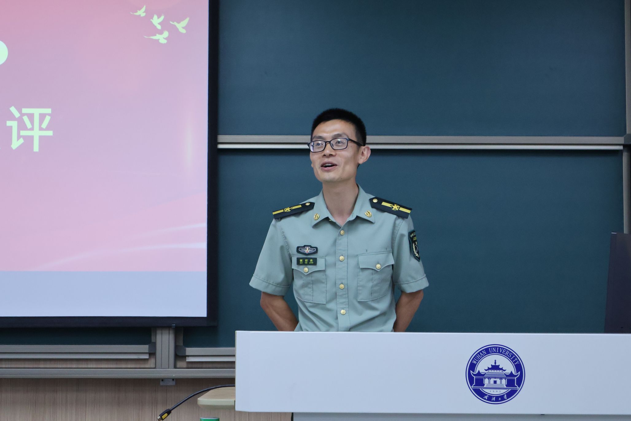 演讲落幕之际,军训五团政委郭衍良对本次比赛进行点评。他充分肯定了参赛同学们的优秀表现,大家通过鲜活的历史素材与真挚的情感表达,展现出对抗战历史的深刻认知和对家国情怀的真切认同,充分体现了新时代青年的历史使命感。同时也针对参赛同学的不足之处,提出具体的改进建议。最后,郭衍良老师勉励在场同学,希望大家以此次演讲比赛为契机,传承伟大抗战精神,持续深化国防意识,将个人理想与国家发展紧密结合,以实际行动践行新时代青年的责任与担当。