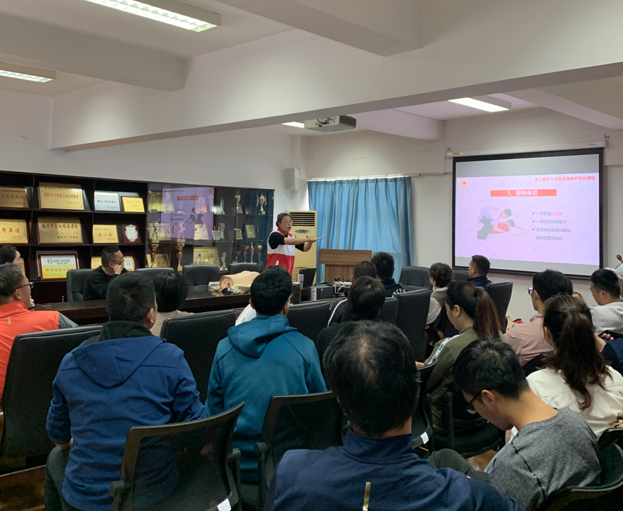 培训会上,邱贤云老师首先详细讲解了急救的理论知识。然后,现场演示了心肺复苏的操作要领、手法、注意事项和AED的正确使用的方法。最后,参训人员进行了急救模拟,邱贤云老师现场指导。