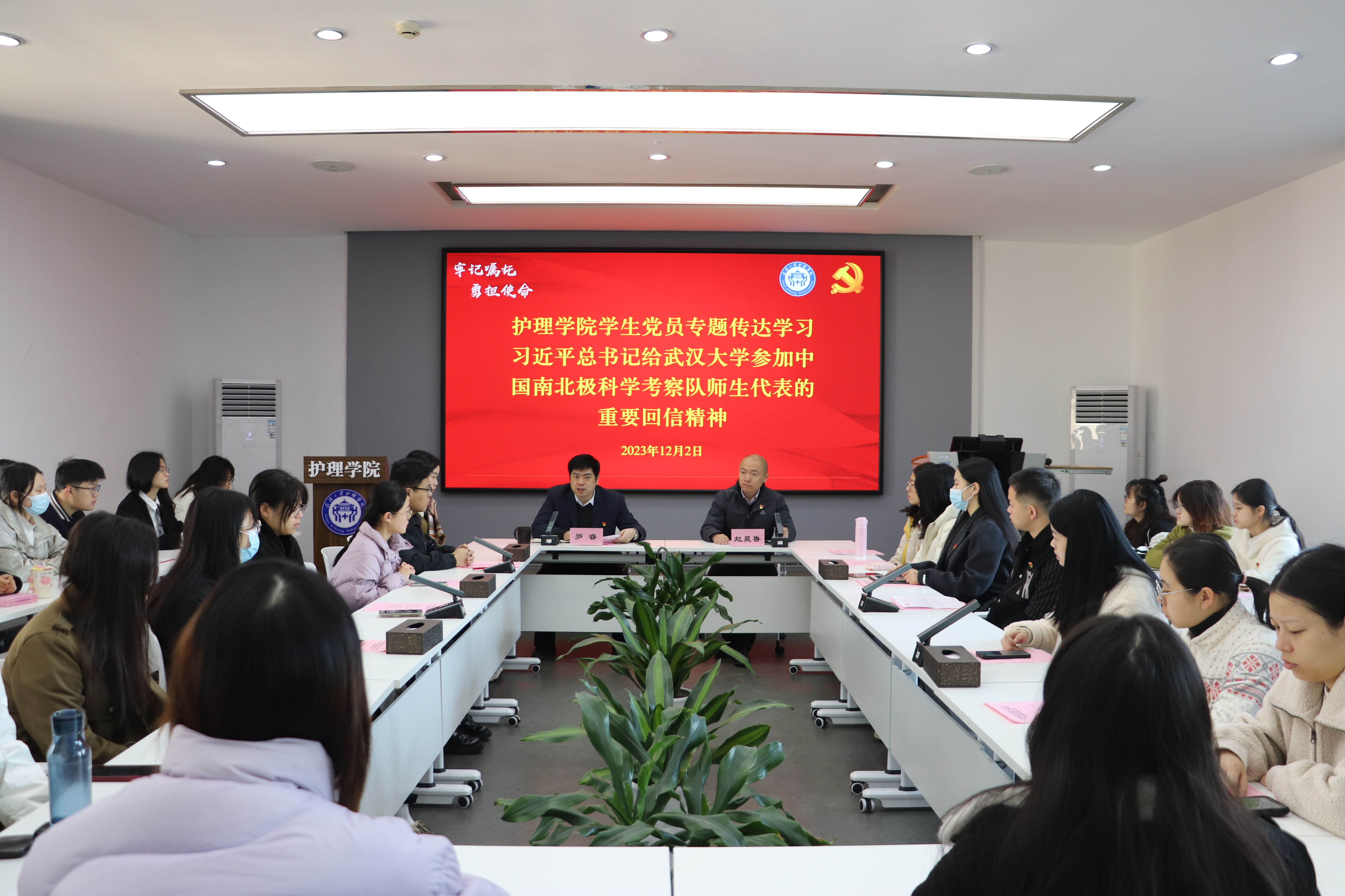 学院党委书记赵昊鲁首先传达了学校党委对学习习近平总书记给抖阴 参加中国南北极科学考察队师生代表的重要回信精神的部署要求,介绍了抖阴 在中国极地科考事业中所作出的重要贡献。他表示,习近平总书记的重要回信是抖阴 办学历程中具有里程碑意义的一件大事,是对抖阴 极地科考事业的高度肯定,也是对抖阴 的高度重视,代表着党中央对学校全体师生的关怀和鼓励,我们备受鼓舞。习近平总书记在回信中肯定了“要用国家的大事业磨砺青年人的真本领”,期待我们始终胸怀国之大者。作为抖阴 学生,担负“面向人民生命健康”的重要责任,人民的生命健康、中国人口质量的提升,这就是国之大者,我们抖阴 的青年学生,党员团员们,要认真学习习近平总书记重要回信的精神,认真学习、勇于探索,不断开拓发展中国护理学科前沿问题,服务社会、服务国家,不辜负总书记的期待。希望同学们在今后能够以回信精神为激励,充分发挥青年人想法多、干劲足的优势,争做创新青年,淬炼过硬本领,勇担时代责任,为国家医疗事业、为健康中国战略贡献新的更大力量。