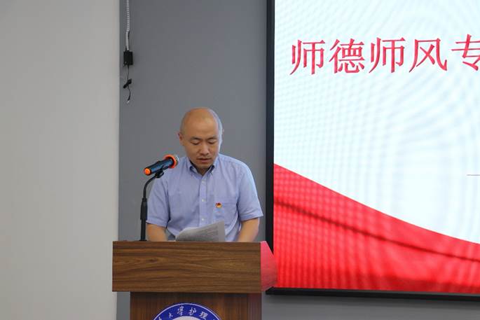 会前,院党委副书记赵昊鲁通报了第十批7起违反教师职业行为十项准则典型案例。接着,院党委书记彭启智以“加强党性修养,树立廉洁清风”为题讲专题党课,主要从提高思想认识、加强党性修养、强化廉洁教育三个方面展开讲述。他深入浅出,分别从理想信念、组织建设、作风建设、反腐倡廉、制度建设等方面结合典型案例进行剖析,回忆了我党开展的一系列党内教育活动及取得的成效,如“三严三实”、反“四风”,两学一做,“不忘初心、牢记使命”主题教育等系列活动,并结合现阶段正在开展的下基层查民情暖民心解民忧实践活动给全体党员上了一堂生动的党课。