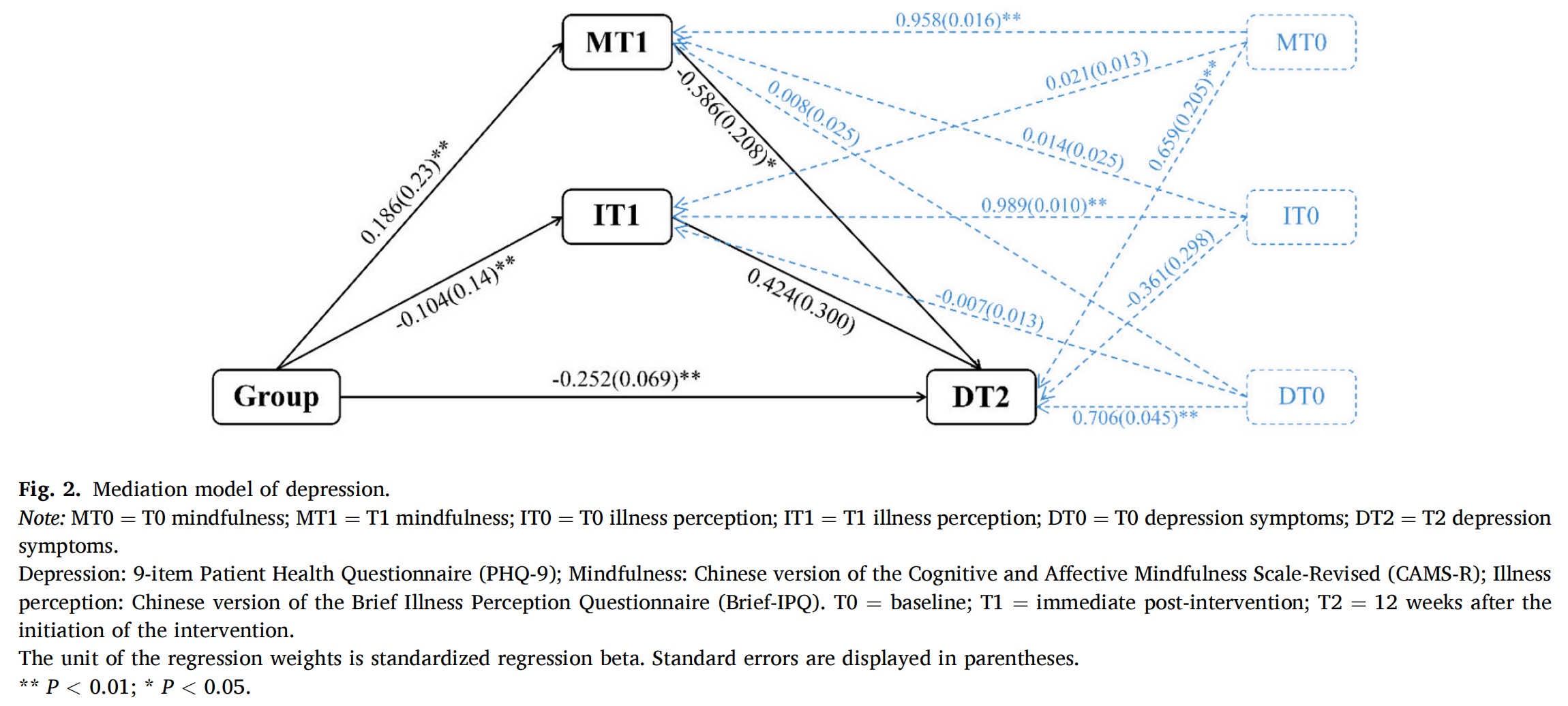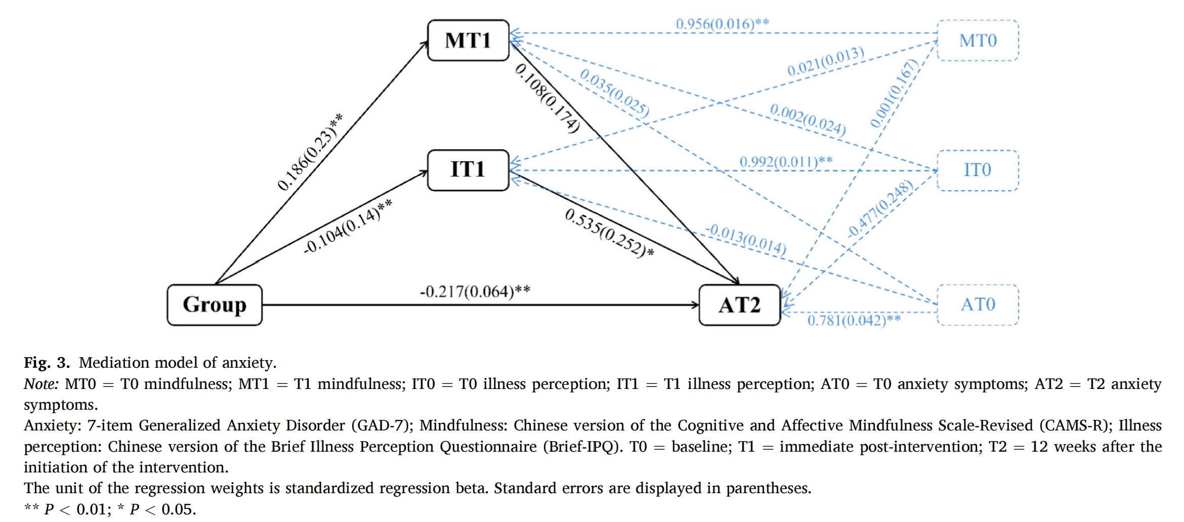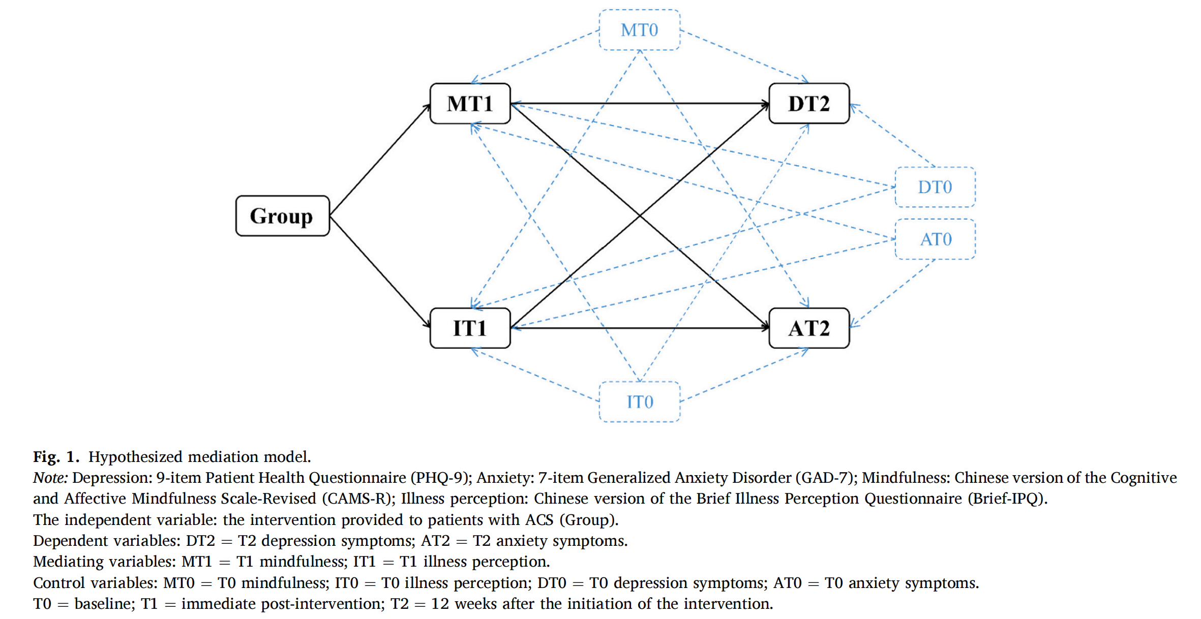 本研究为一项纵向中介分析,取用检验MCARE项目的随机对照试验的数据。该研究于2020年6月至9月期间在济南市两所三甲医院心内科招募符合标准的ACS患者为参与者。MCARE项目包括连续六周每周一次的一对一课程,每周的主题包括正念技能和疾病管理两方面。第一周的干预在患者住院期间线下开展,随后5周的干预通过微信线上开展。纳入本研究分析的数据包括在基线(T0)、干预后即刻(T1)和干预开始后12周(T2)测量的主要结局变量,即抑郁(PHQ-9)和焦虑(GAD-7),以及潜在中介变量,即正念水平(CAMS-R)和疾病感知(Brief-IPQ)。采用结构方程模型和Bootstrap迭代法(5000次)进行中介效应分析。根据MCARE项目的理论框架,我们提出了一个假设的中介模型,将T2抑郁症状和T2焦虑症状设为因变量,将提供给ACS患者的干预(Group) 设为自变量, T1正念水平和T1疾病感知设为中介变量。在调整基线测量的抑郁症状或焦虑症状、正念水平和疾病感知后,我们为每个因变量分别构建了中介结构方程模型。