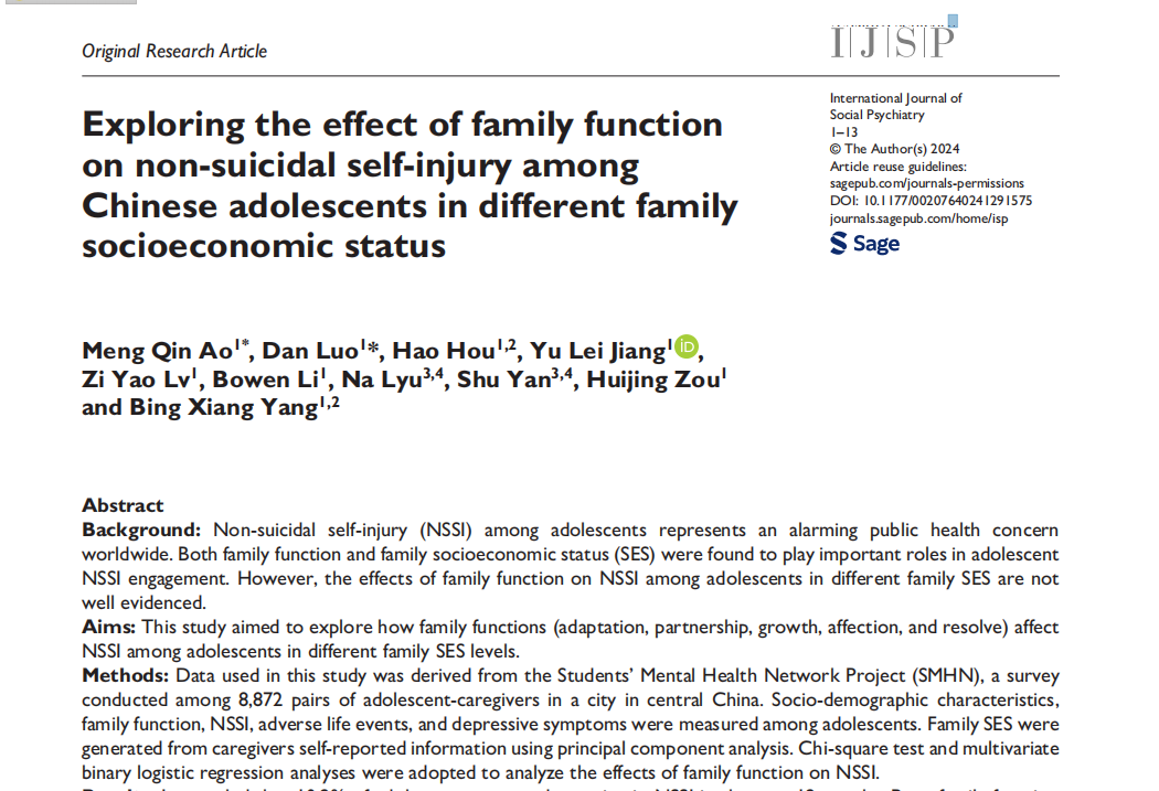 非自杀性自伤行为高发于青少年人群,已成为严重的公共卫生及社会问题。近日,中心研究生敖梦琴在《International Journal of Social Psychiatry》(JCR二区,IF=2.5)期刊上发表了题为“Exploring the Effect of Family Function on Non-Suicidal Self-Injury among Chinese Adolescents in Different Family Socioeconomic Status”的研究论文。抖阴
