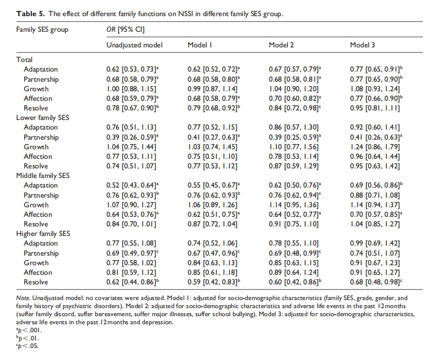 进一步分析发现,不同家庭SES水平的青少年在家庭功能的各个维度(如适应能力、伙伴关系、成长、关爱和解决能力)对NSSI的影响存在差异,其中伙伴关系、适应能力和关爱、解决能力分别被识别为低、中、高家庭SES青少年的保护因素。因此,针对家庭功能改善的差异化策略被认为是预防和干预青少年NSSI的关键。
