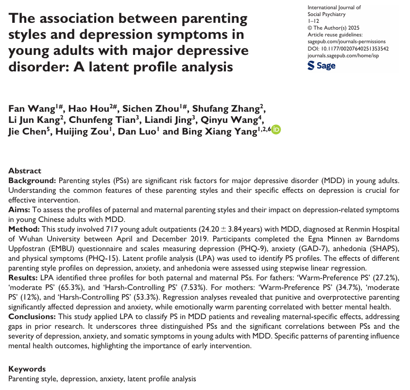 近日,中心杨冰香教授课题组硕士研究生王凡在《International Journal of Social Psychiatry》(中国科学院三区,JCR二区;IF=2.5)期刊上发表了基于潜在剖面分析方法探索住院重度抑郁障碍患者父母教养方式和疾病症状关联的最新研究成果(见图1)。论文题目为“The association between parenting styles and depression symptoms in young adults with major depressive disorder: A latent profile analysis”。抖阴