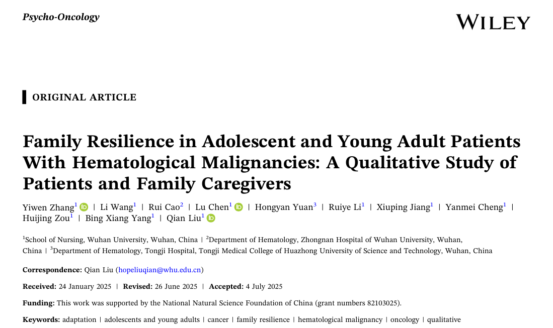 近日,中心研究生张艺文在国际期刊《Psycho-Oncology》(JCR一区;中国科学院二区;IF=3.5)上发表了题为“Family Resilience in Adolescent and Young Adult Patients With Hematological Malignancies: A Qualitative Study of Patients and Family Caregivers”的研究论文。抖阴