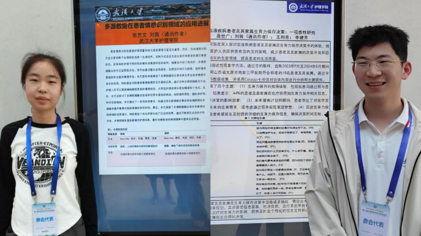 张艺文、庞世广同学在壁报展区展示了自己的研究成果。张艺文同学壁报的内容为《多源数据在患者情感识别领域的应用进展》,通过阐述多源数据的主要来源及其在临床情感评估中的优势,特别是在识别患者情感细微变化方面的应,护理人员可以更准确地捕捉患者的情感波动,从而在护理决策中更加精准和个性化。研究生庞世广同学展示了其研究壁报《血液疾病患者及其家属在生育力保存决策中的体验、挑战和需求》,引起了与会者的广泛关注。该研究旨在深入探讨血液疾病患者及其家属在生育力保存决策中的多重体验,尤其是决策过程中的挑战与需求,为临床护理工作提供更有效的支持策略。参会期间,他们与来自全国各地的护理专家、学者、临床护士等不同岗位的护理工作者进行了讨论,加强了合作与交流,为后续开展研究提供了思路和支持。