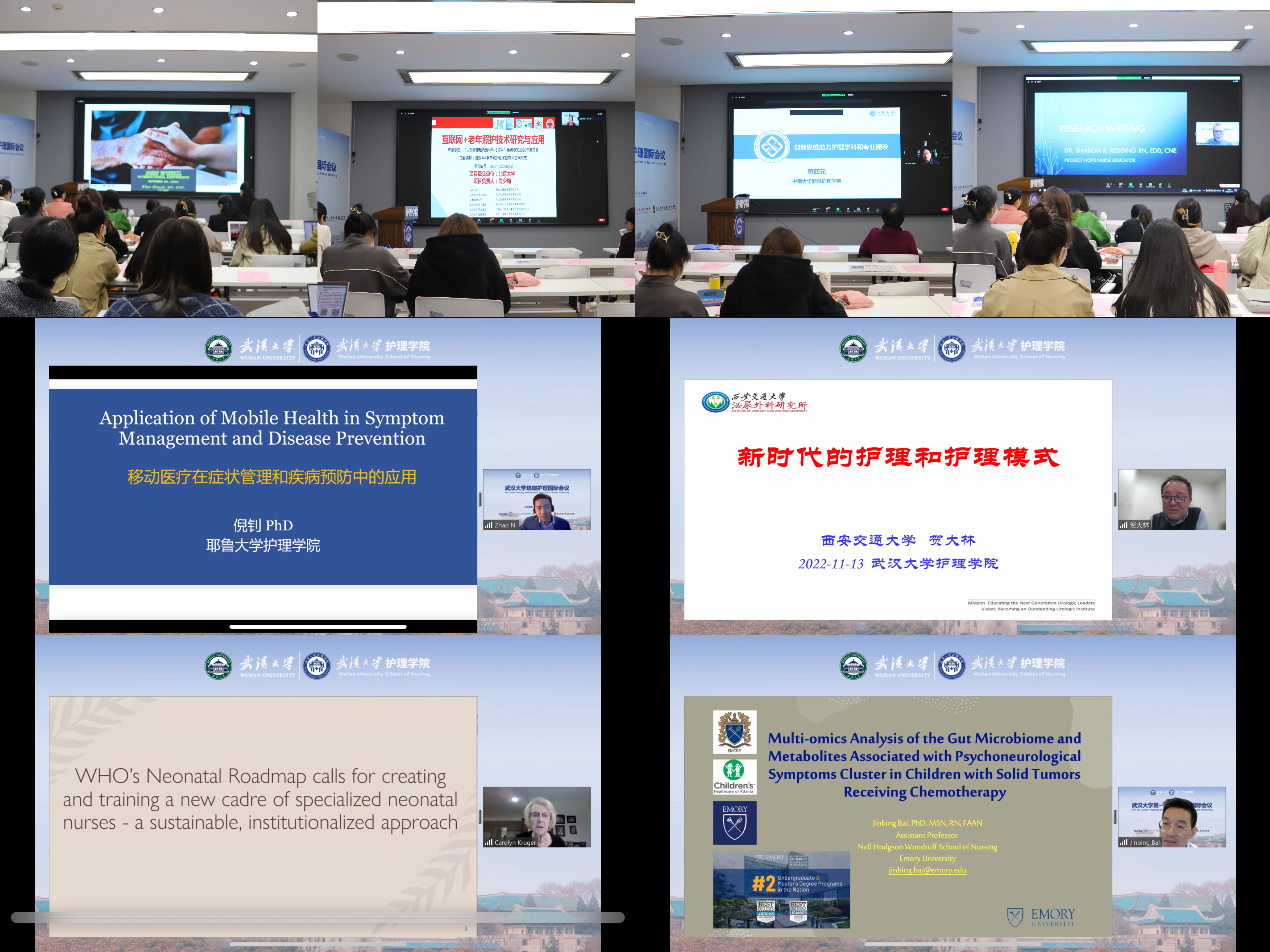 On November 13, 2022, the first Luojia Nursing International Conference of Wuhan University was held as scheduled in a synchronous live streaming mode, both online and offline. The conference was hosted by the School of Nursing of Wuhan University, co organized by the Nursing Department of People's Hospital of Wuhan University, the Nursing Department of Central South Hospital of Wuhan University, and the Nursing Department of Wuhan University Stomatological Hospital. Professor Wu Xinjuan, Chairman of the Chinese Nursing Association, delivered a speech at the conference. The conference aims to strengthen the exchange and cooperation between outstanding scholars at home and abroad, share cutting-edge nursing achievements and experiences, and actively explore the path of high-quality nursing development in the context of the new era. The conference includes two themed forums, Professor Ellen Blanch from Massachusetts General Hospital in the United States, Professor Carolyn Kruger from the World Health Foundation in the United States, Professor Benjamin Tan from the School of Nursing at Charles Darwin University in Australia, Professor Wang Wenru from the School of Nursing at the National University of Singapore, and Professor Che Xiying from the School of Nursing at The Chinese University of Hong Kong Professor Shang Shaomei from the School of Nursing at Peking University and 15 well-known experts and scholars in the field of nursing and related fields from home and abroad gathered on the cloud, sharing their learning and practical experience from three themes: clinical nursing practice and the latest scientific research achievements, nursing talent cultivation and talent team construction, and nursing discipline construction. Over 15000 nursing colleagues from home and abroad watched the online live broadcast.